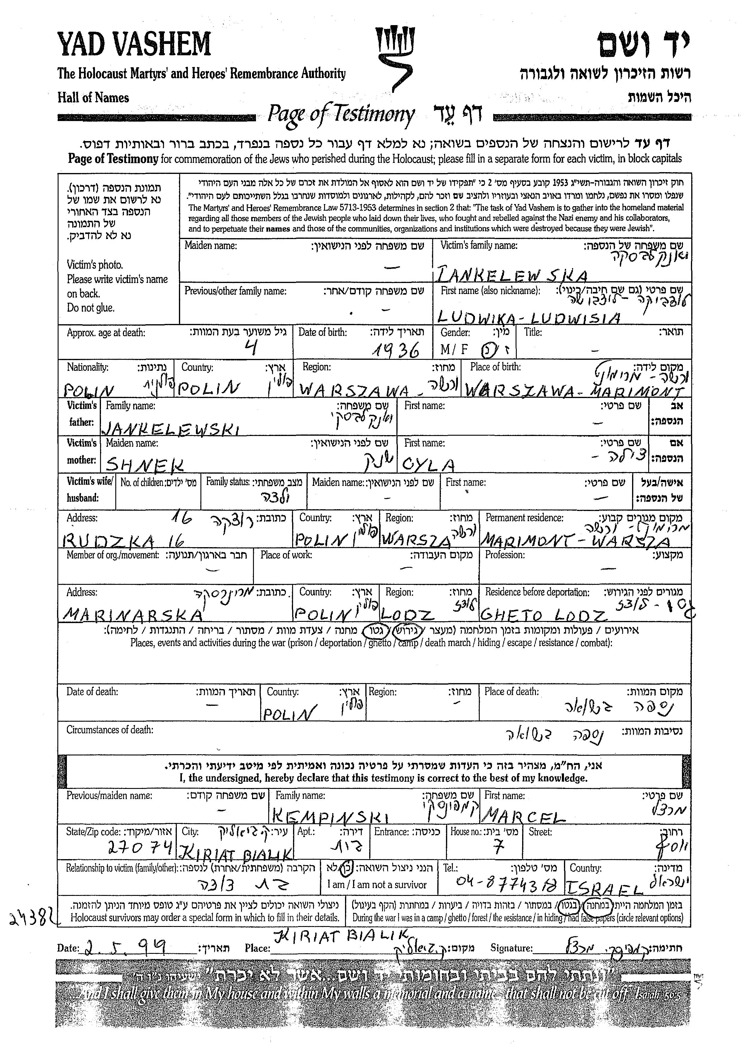 Ludwika Iankelewska wurde im Jahr 1936 in Warsaw, Polen geboren. Sie war die Tochter von Cyla. Sie war Kind. Vor dem Zweiten Weltkrieg lebte sie in Warsaw, Polen. Während des Krieges war sie in Lodz, Polen.