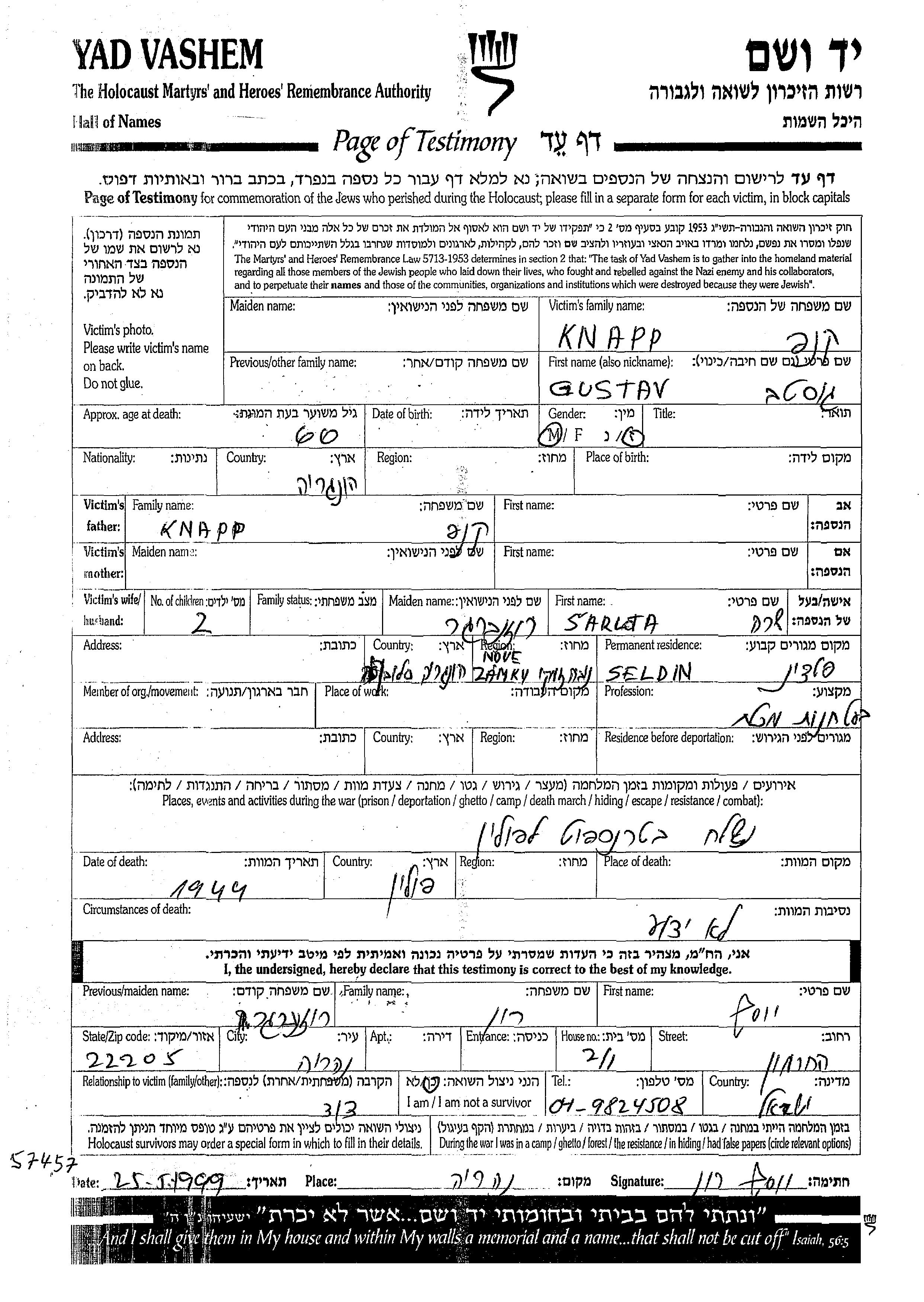 Gustav Knapp wurde in Ungarn geboren. Er war Besitzer/-in eines lebensmittelgeschäfts. Vor dem Zweiten Weltkrieg lebte er in Seldin, Tschechoslowakei.
