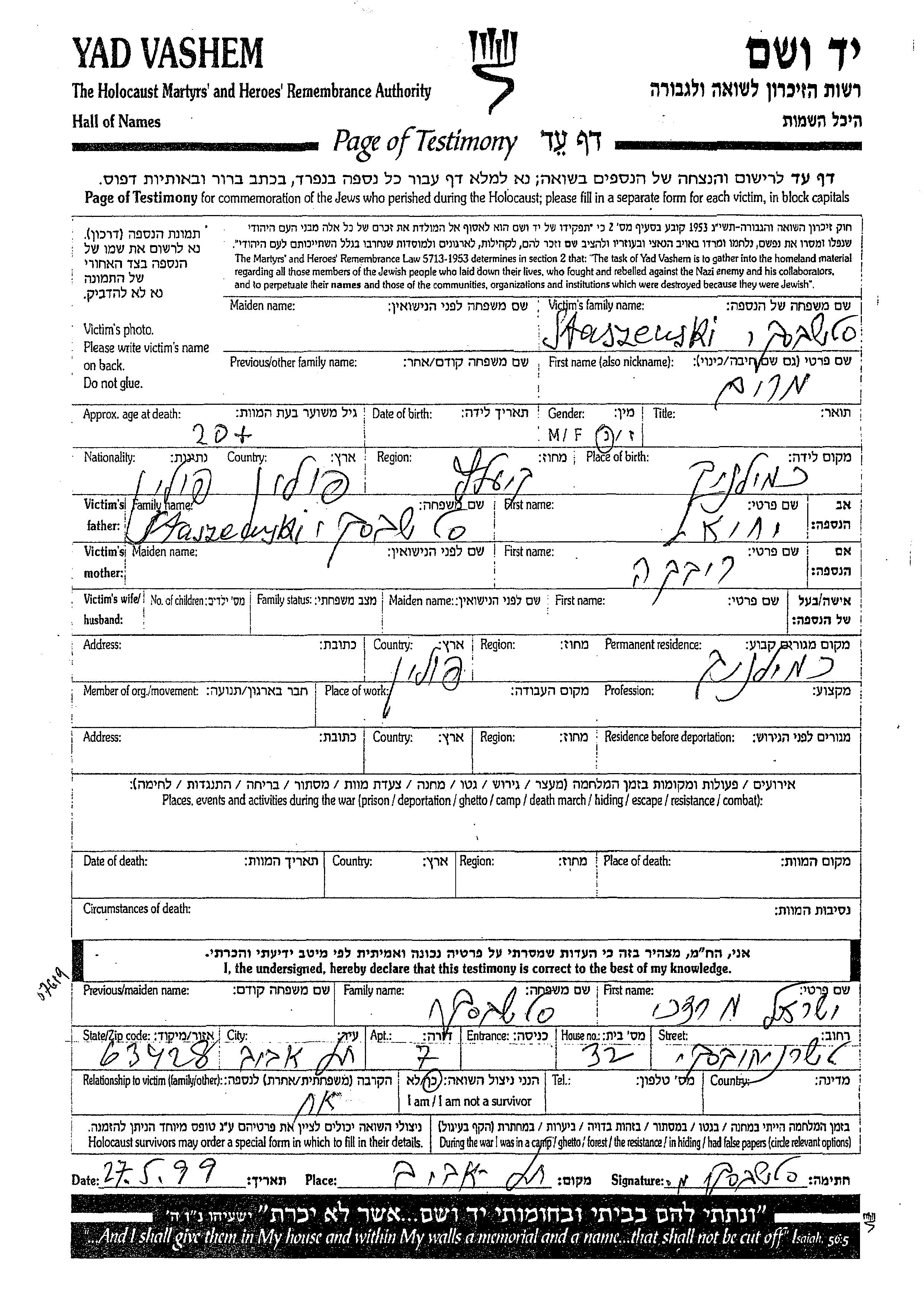Staszewski Miriam Khmilnik, Ukraine (UdSSR) Gedenkblatt