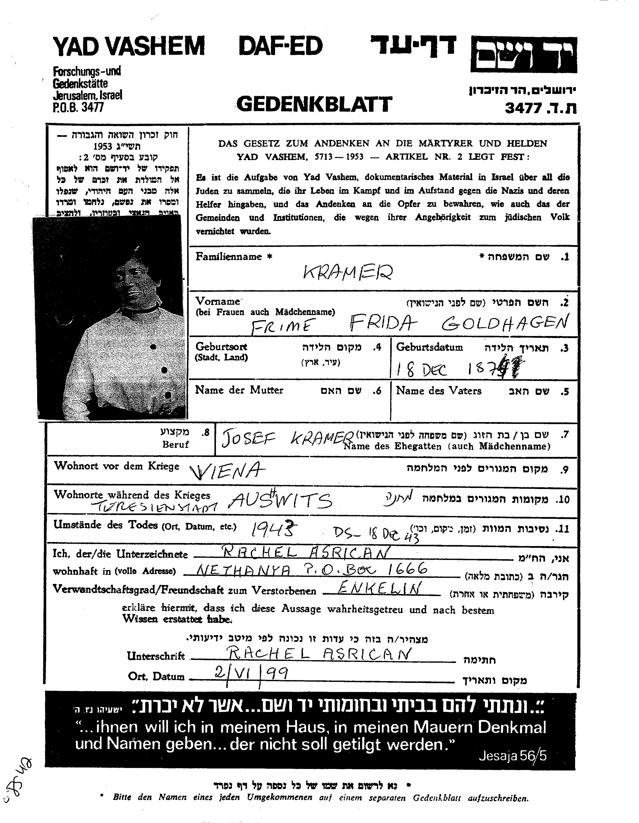 Frima Frida Kremer, geb. Goldhagen wurde im Jahr 1874 geboren. Sie war mit Josef Verheiratet. Vor dem Zweiten Weltkrieg lebte sie in Wien, Österreich. Während des Krieges war sie in Auschwitz, Polen.