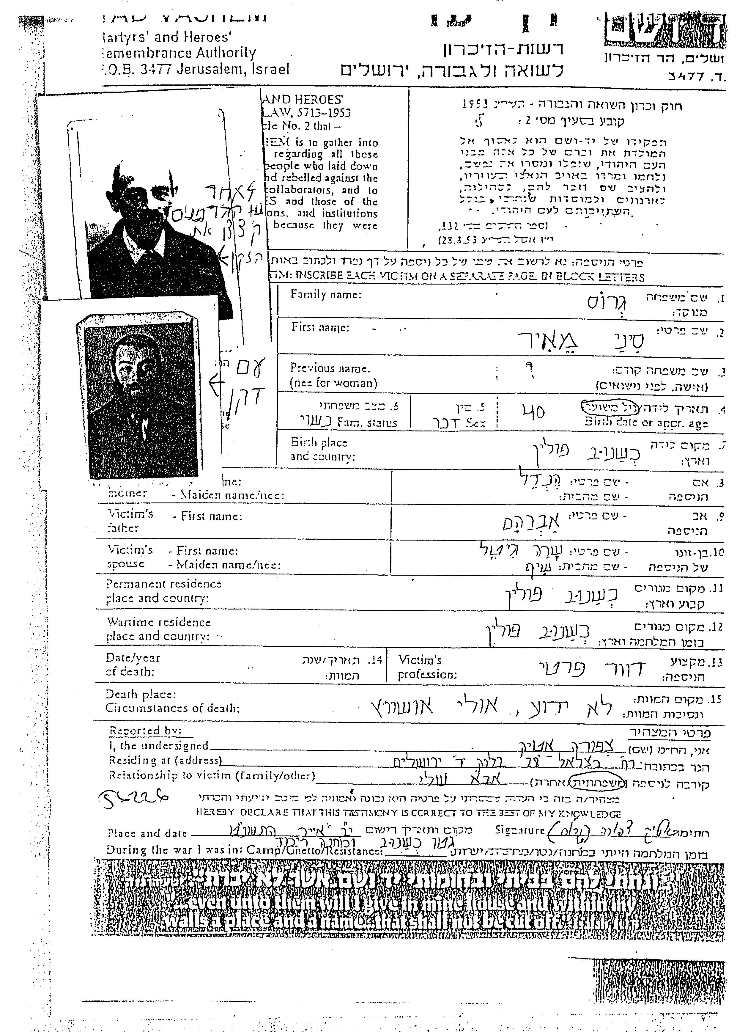 Sinai Meir Gros wurde in Chrzanow, Polen geboren. Er war der Sohn von Avraham und Hendel. Er war Postbote und mit Sara Gitel, geb. Shif Verheiratet. Vor dem Zweiten Weltkrieg lebte er in Chrzanow, Polen. Während des Krieges war er in Chrzanow, Polen.