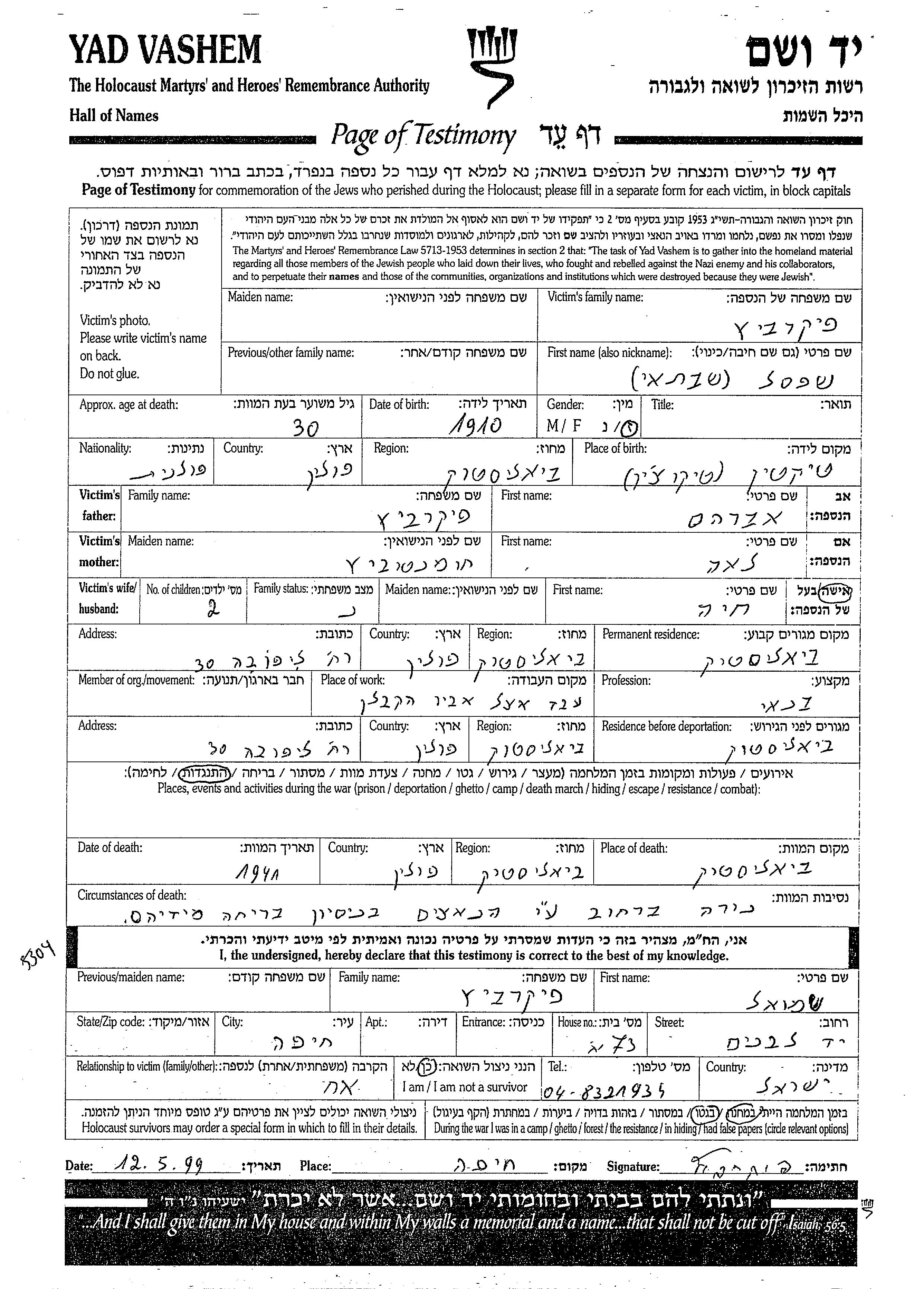 Shabtai wurde in der Schoah ermordet. Todesort: Bialystok, Polen im Jahr 1941.