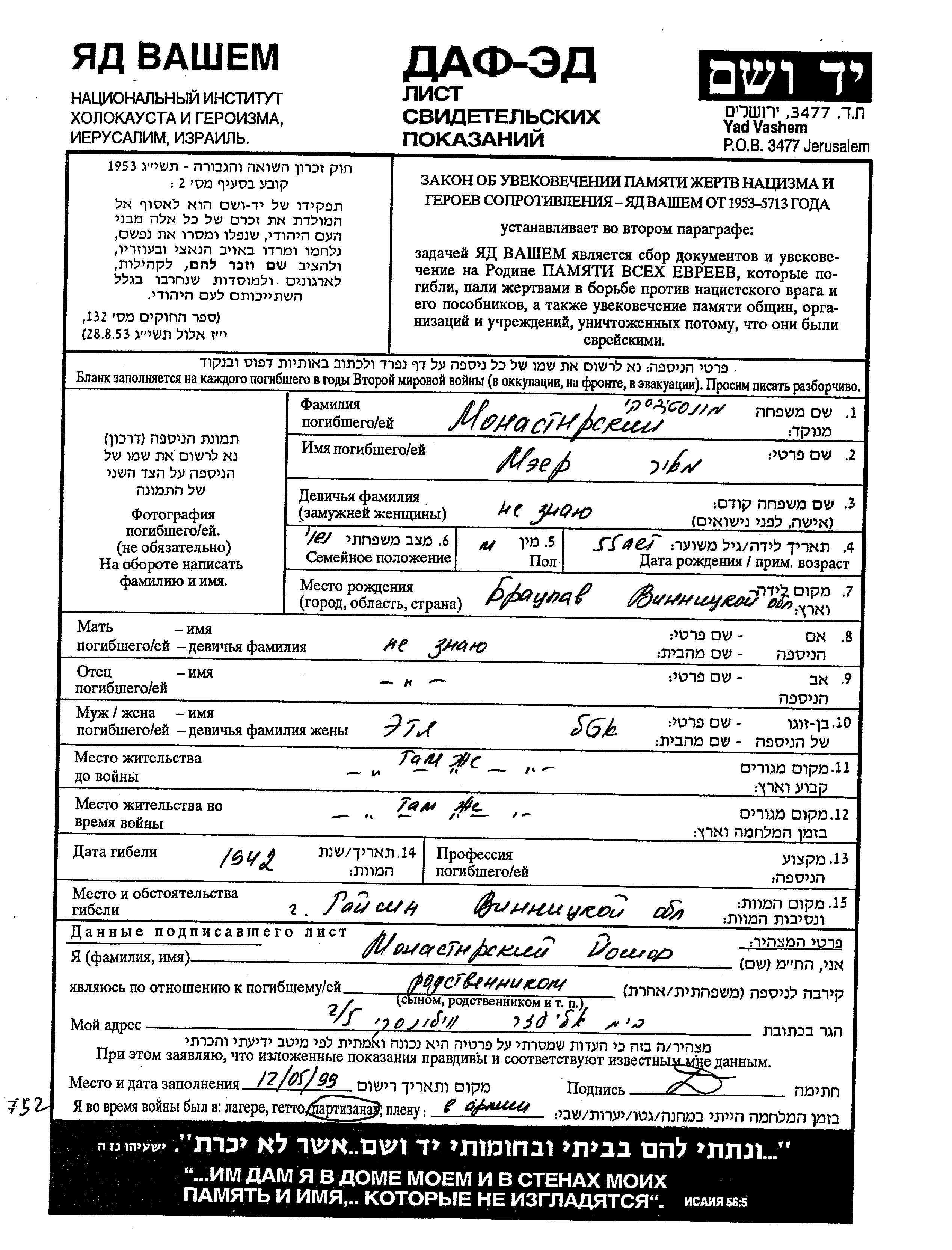 Meyer Monastyrski wurde in Bratslaw, Ukraine (UdSSR) geboren. Er war mit Etl Verheiratet. Vor dem Zweiten Weltkrieg lebte er in Bratslaw, Ukraine (UdSSR). Während des Krieges war er in Bratslaw, Ukraine (UdSSR).