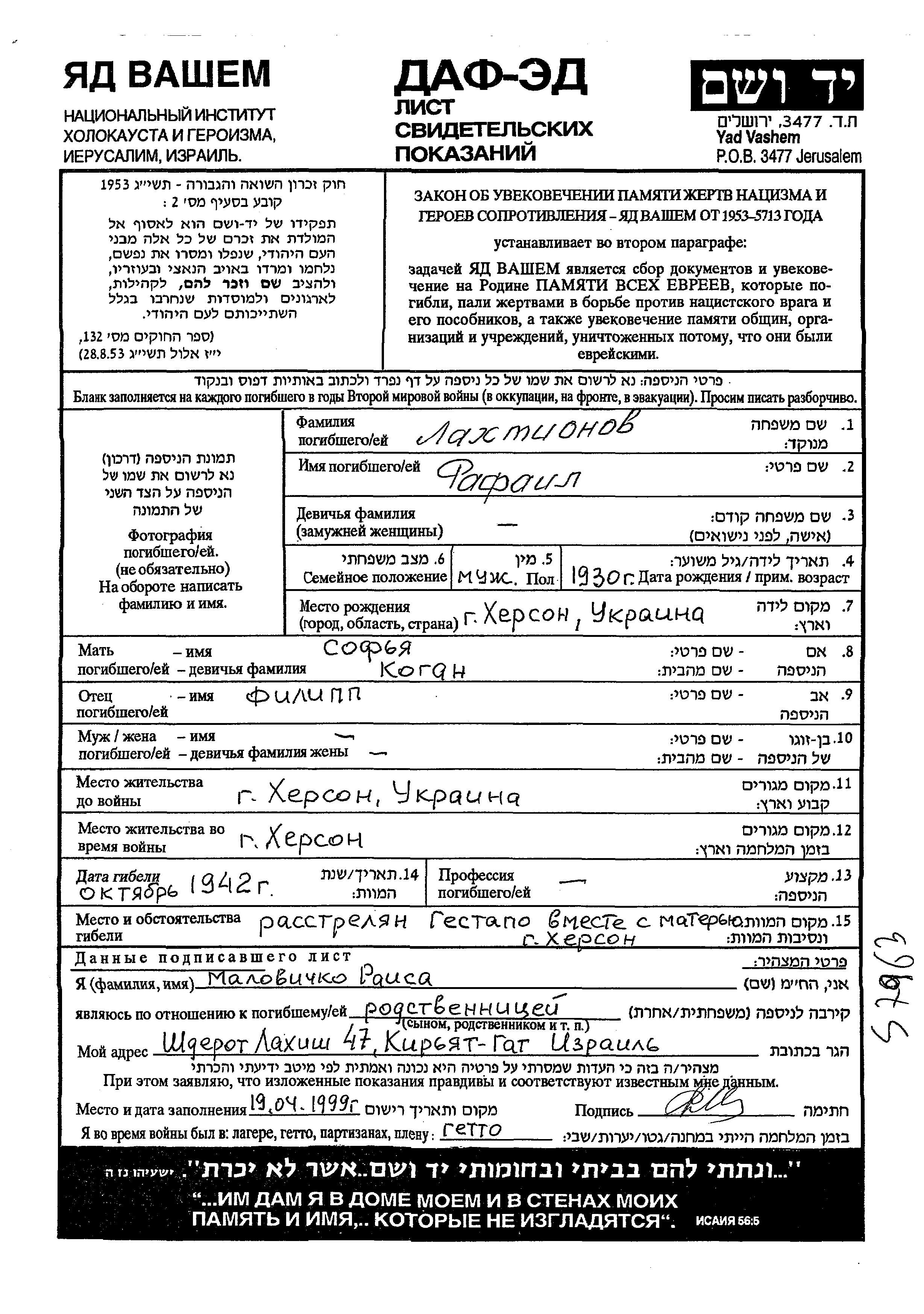 Rafael wurde in der Schoah ermordet. Todesort: Kherson, Ukraine (UdSSR) im Jahr 1942.