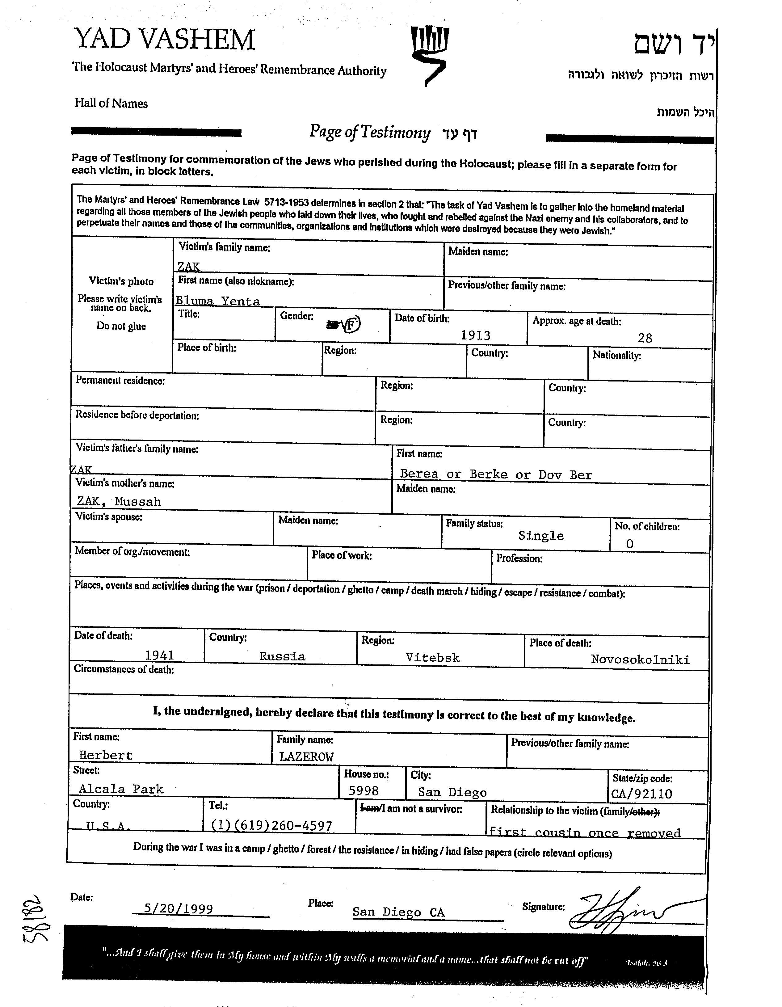 Bluma Yenta Zak wurde im Jahr 1913 geboren. Sie war die Tochter von Berea und Mussah. Sie war Ledig.