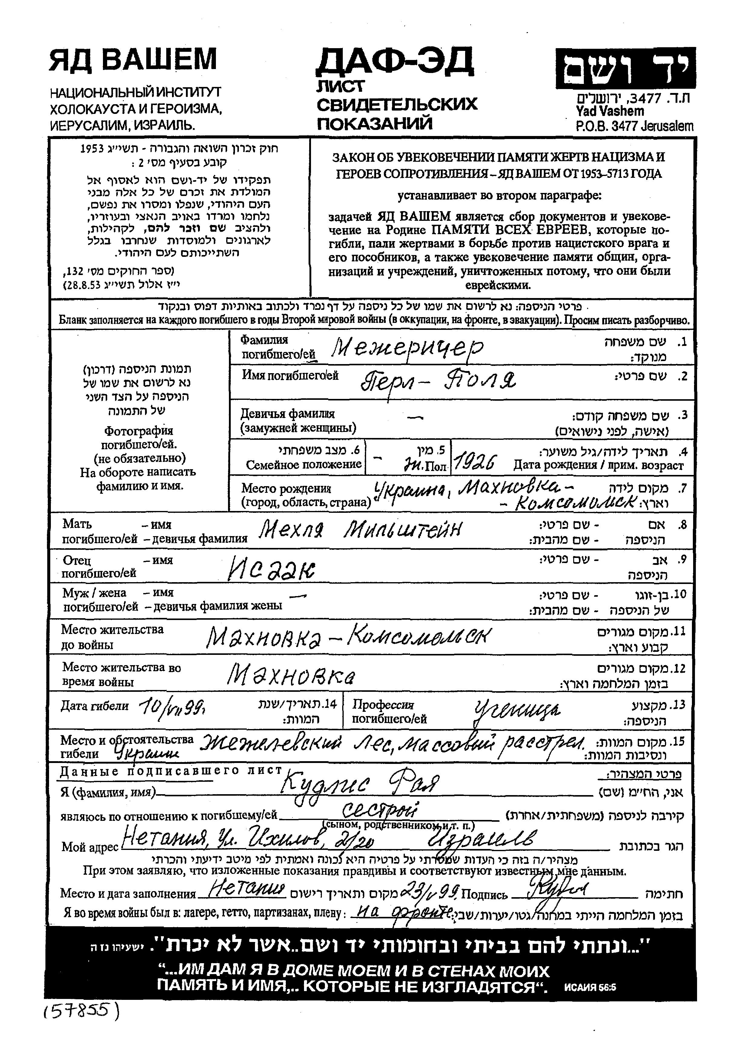 Perl Polya Mezhericher Milshtein wurde im Jahr 1926 in Makhnovka, Ukraine (UdSSR) geboren. Sie war die Tochter von Isaak und Mekhlya. Sie war Schüler/-in und Ledig. Vor dem Zweiten Weltkrieg lebte sie in Makhnovka, Ukraine (UdSSR). Während des Krieges war sie in Makhnovka, Ukraine (UdSSR).
