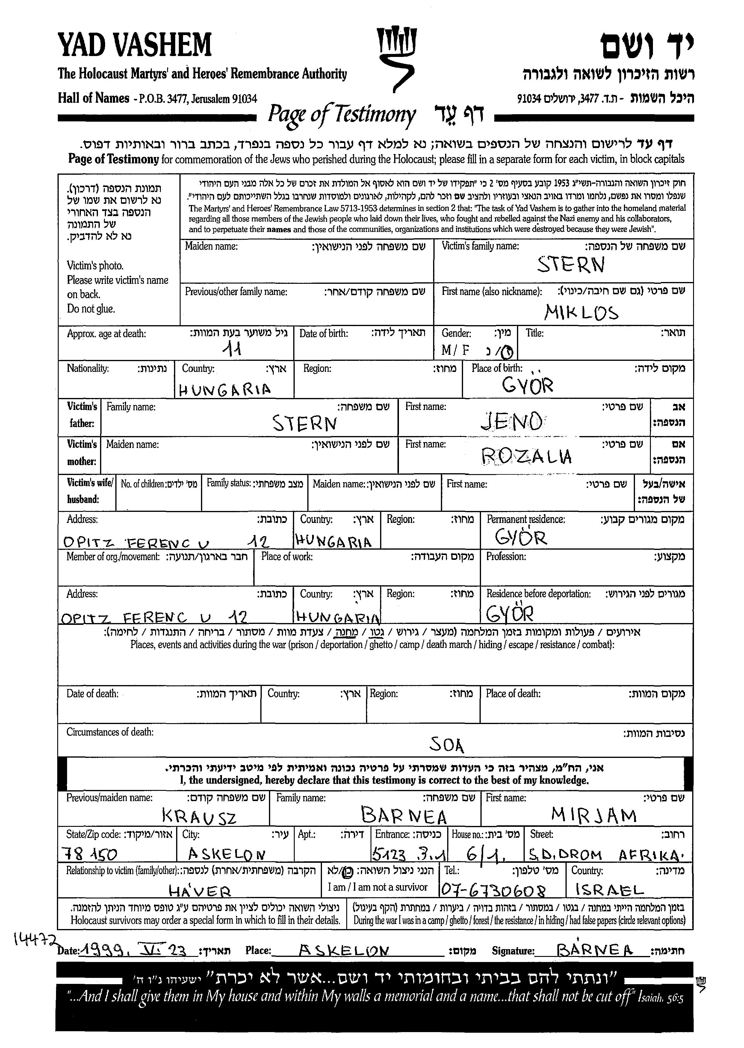 Miklos Stern wurde in Gyor, Ungarn geboren. Er war der Sohn von Jeno und Rozalia. Vor dem Zweiten Weltkrieg lebte er in Gyor, Ungarn. Während des Krieges war er in Gyor, Ungarn.