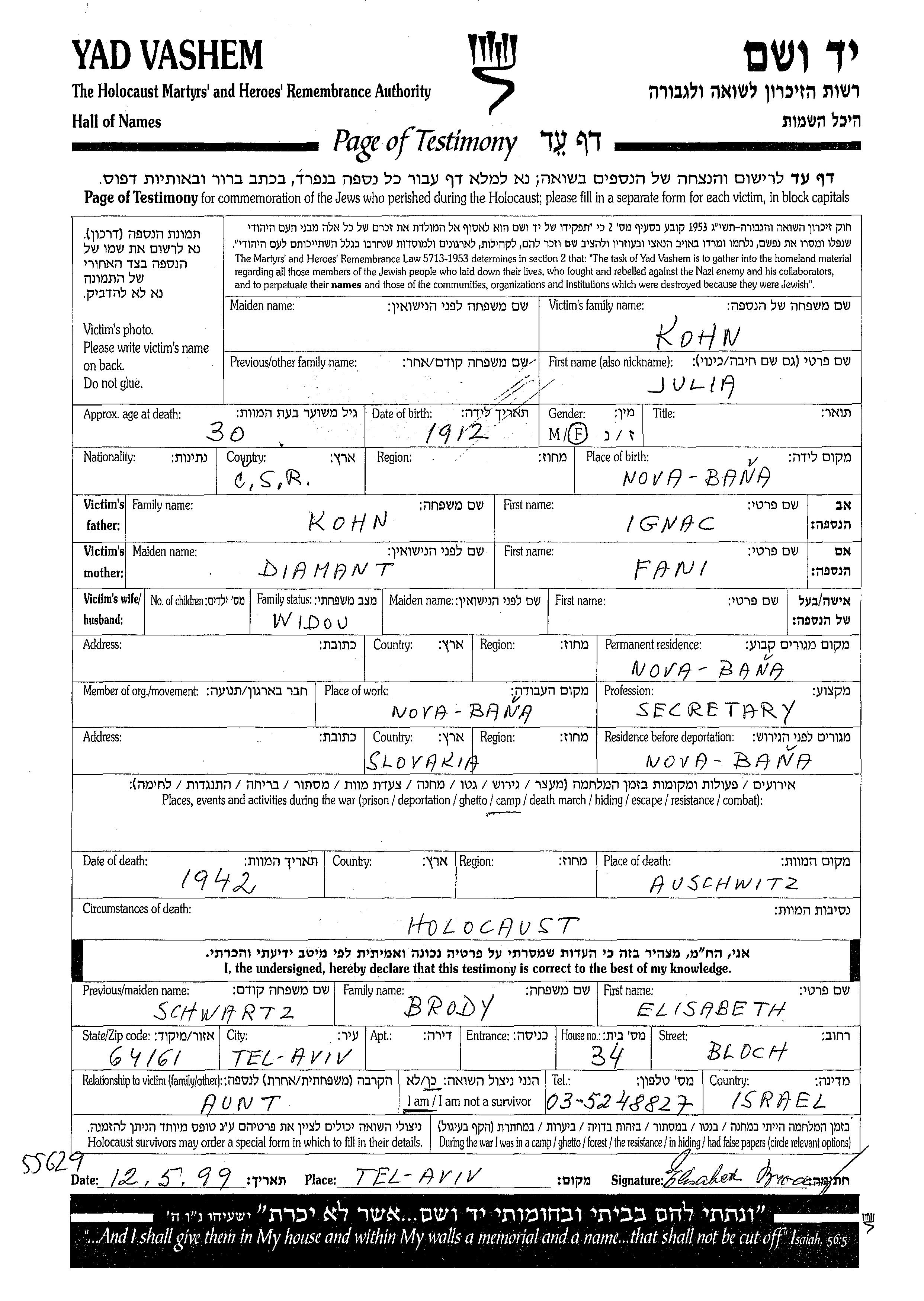 Julia Kohn wurde im Jahr 1912 in Nova Bana, Tschechoslowakei geboren. Sie war die Tochter von Ignac und Fani. Sie war Sekretär/-in und Witwe. Vor dem Zweiten Weltkrieg lebte sie in Nova Bana, Tschechoslowakei. Während des Krieges war sie in Nova Bana, Tschechoslowakei.