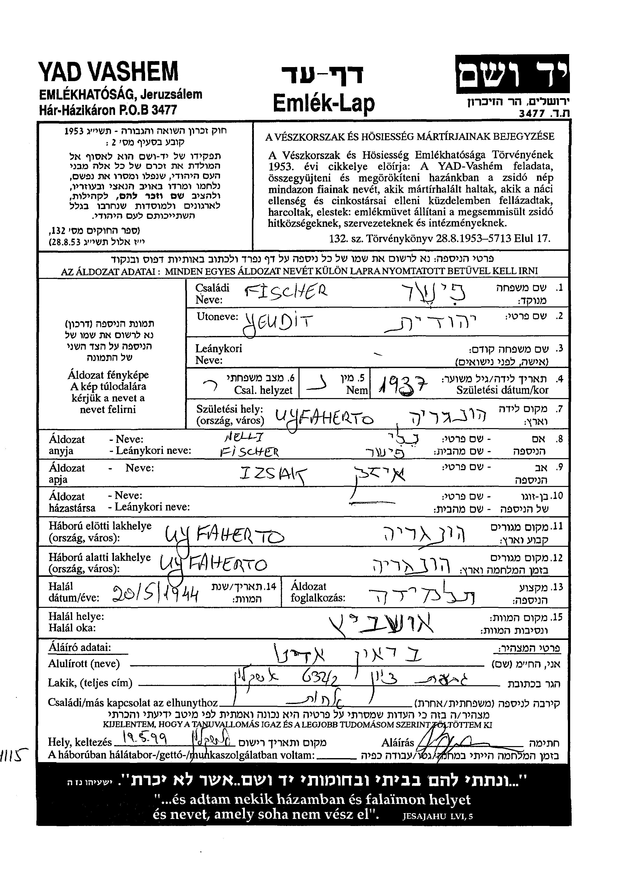 Jeudit Fischer wurde im Jahr 1937 in Ujfeherto, Ungarn geboren. Sie war die Tochter von Izsak und Nelly. Sie war Schüler/-in und Kind. Vor dem Zweiten Weltkrieg lebte sie in Ujfeherto, Ungarn. Während des Krieges war sie in Ujfeherto, Ungarn.