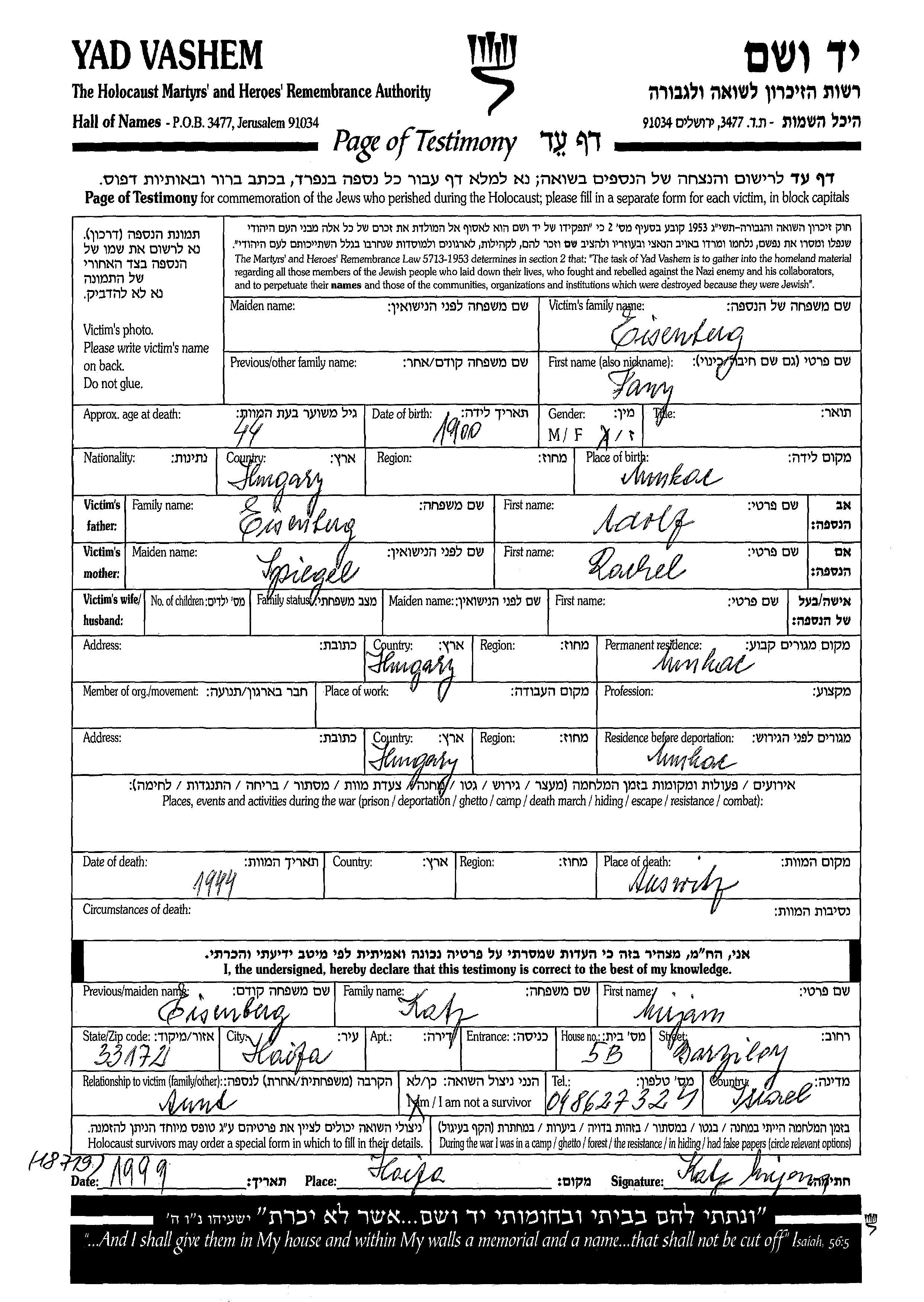 Fany Eisenberg wurde im Jahr 1900 in Munkac, Tschechoslowakei geboren. Sie war die Tochter von Adolf und Rachel. Vor dem Zweiten Weltkrieg lebte sie in Munkac, Tschechoslowakei. Während des Krieges war sie in Munkac, Tschechoslowakei.