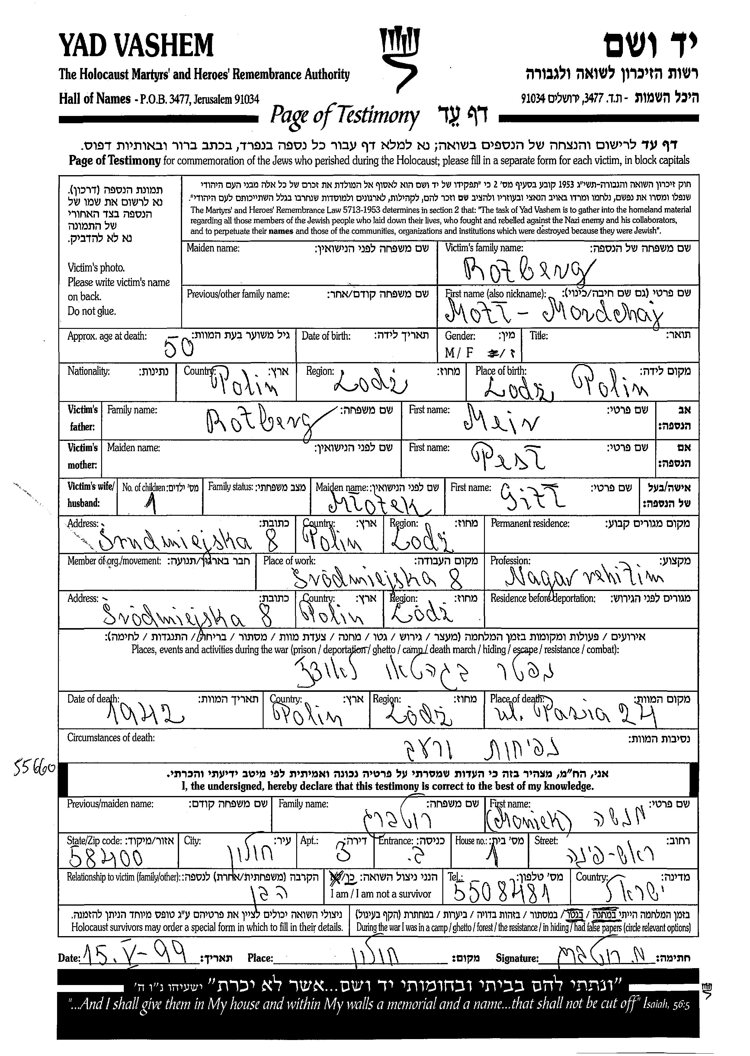 Moti Rotberg wurde in Lodz, Polen geboren. Er war der Sohn von Meir und Pesl. Er war Tischler und mit Gitl, geb. Mlotek Verheiratet. Vor dem Zweiten Weltkrieg lebte er in Lodz, Polen. Während des Krieges war er in Lodz, Polen.