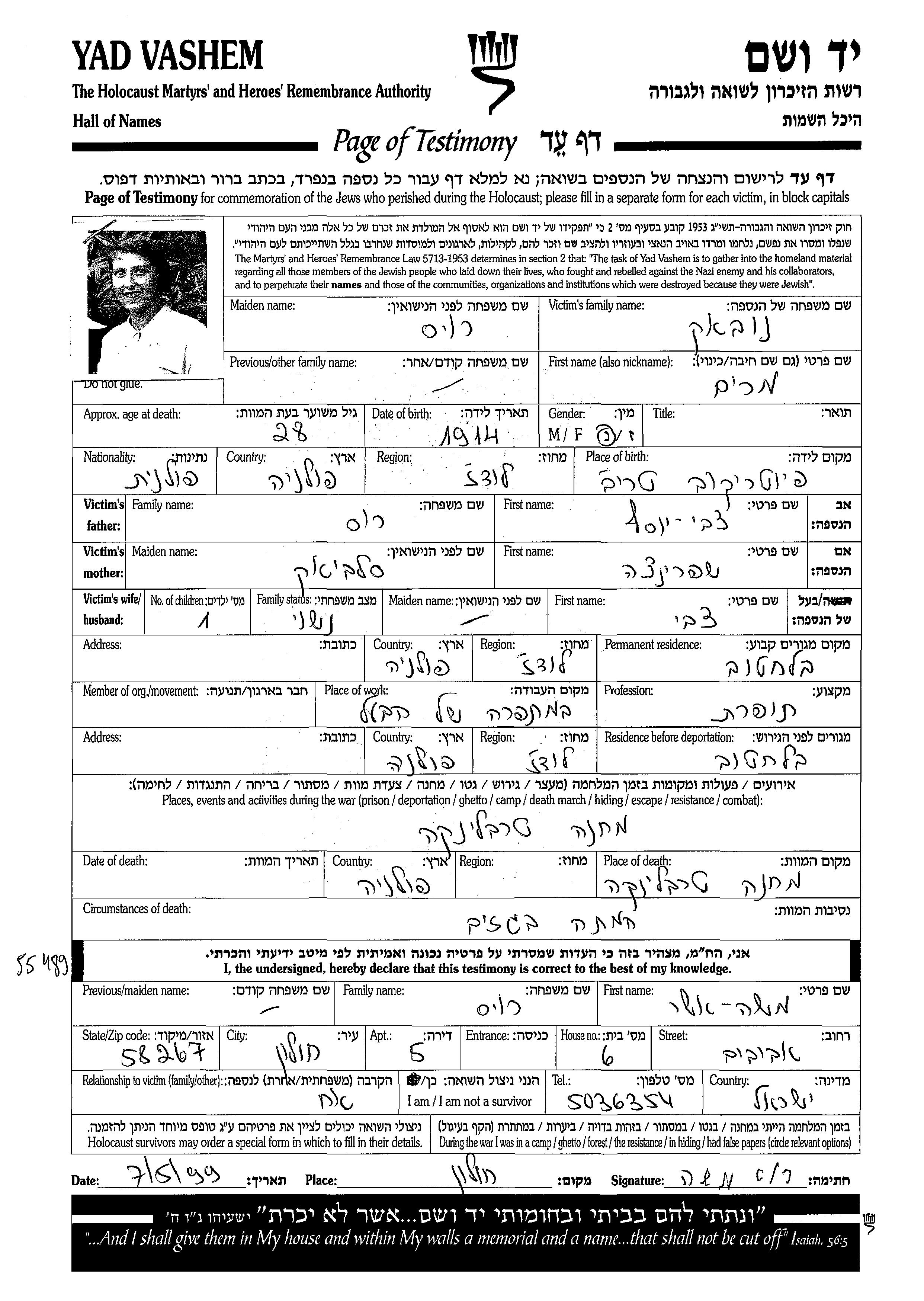 Miriam Nobek, geb. Rus wurde im Jahr 1914 in Piotrkow Trybunalski, Polen geboren. Sie war die Tochter von Tzvi Yosef und Shprintza. Sie war Schneiderin und mit Tzvi Verheiratet. Vor dem Zweiten Weltkrieg lebte sie in Balchatow, Polen. Während des Krieges war sie in Balchatow, Polen.