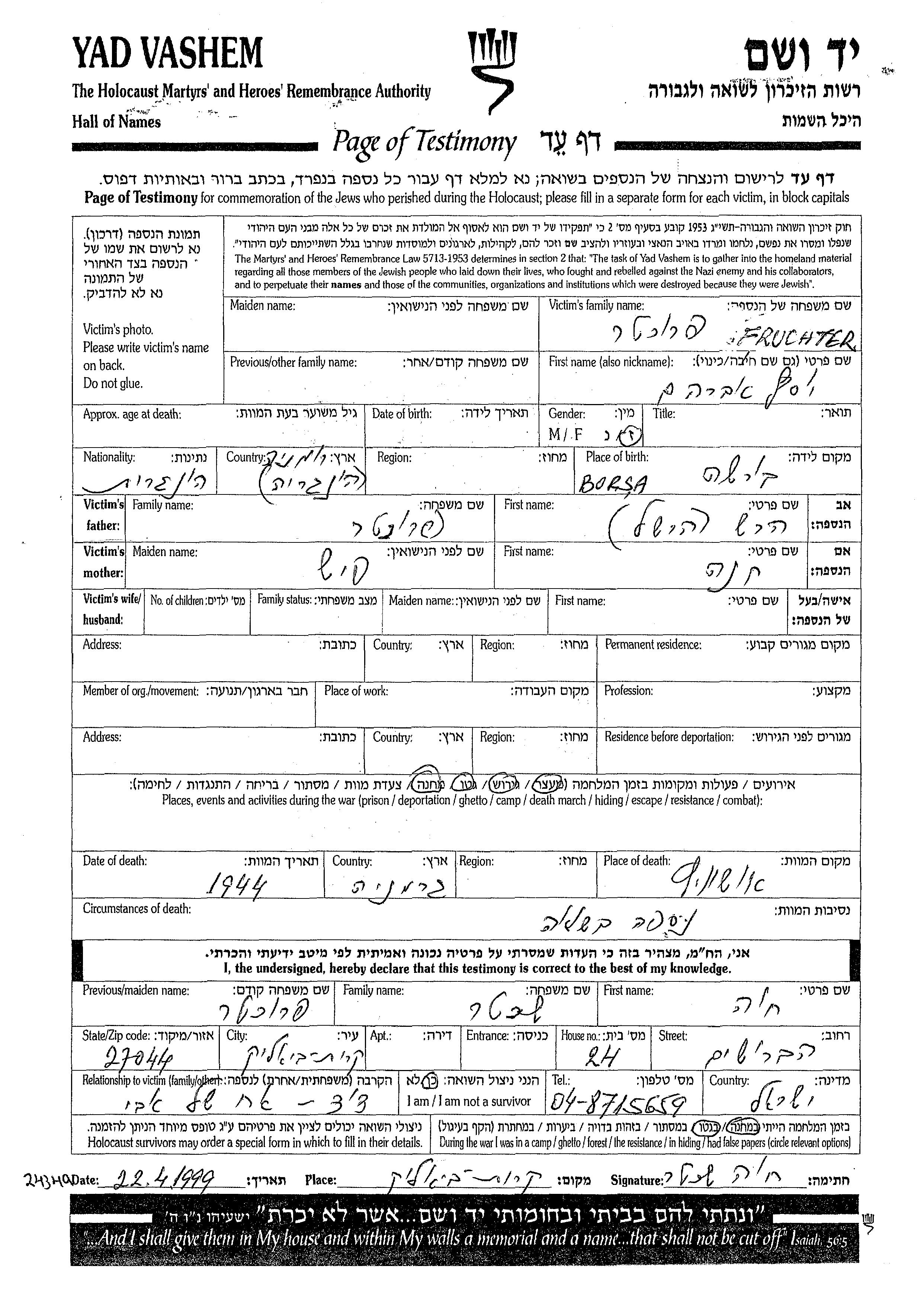 Fruchter Yosef Avraham unbekannter Ort, Gedenkblatt