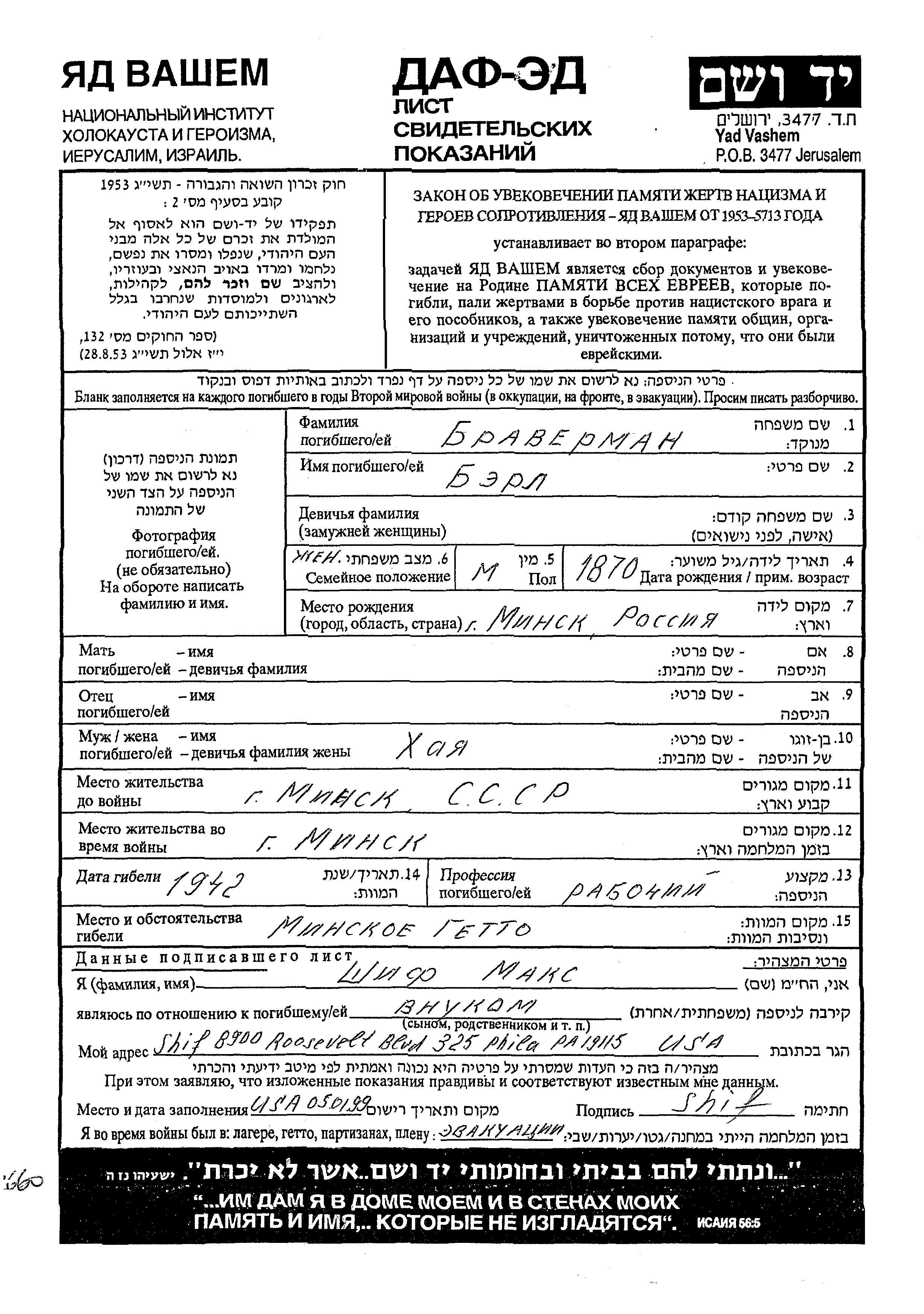 Berl Braverman wurde im Jahr 1870 in Minsk, Weißrussland (UdSSR) geboren. Er war Arbeiter/-in und mit Khaia Verheiratet. Vor dem Zweiten Weltkrieg lebte er in Minsk, Weißrussland (UdSSR). Während des Krieges war er in Minsk, Weißrussland (UdSSR).