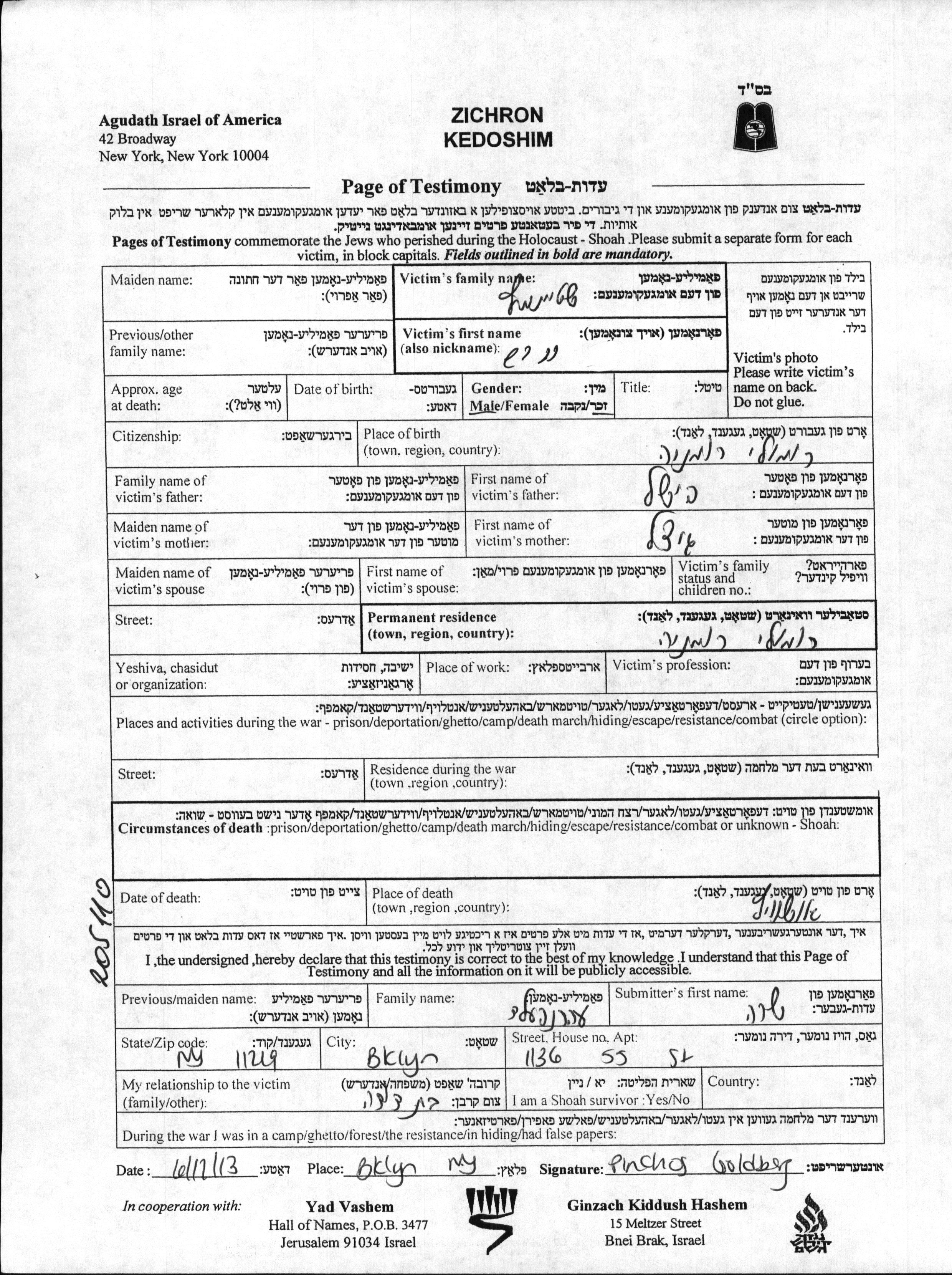 Hersh wurde in der Schoah ermordet. Todesort: Auschwitz, Polen.