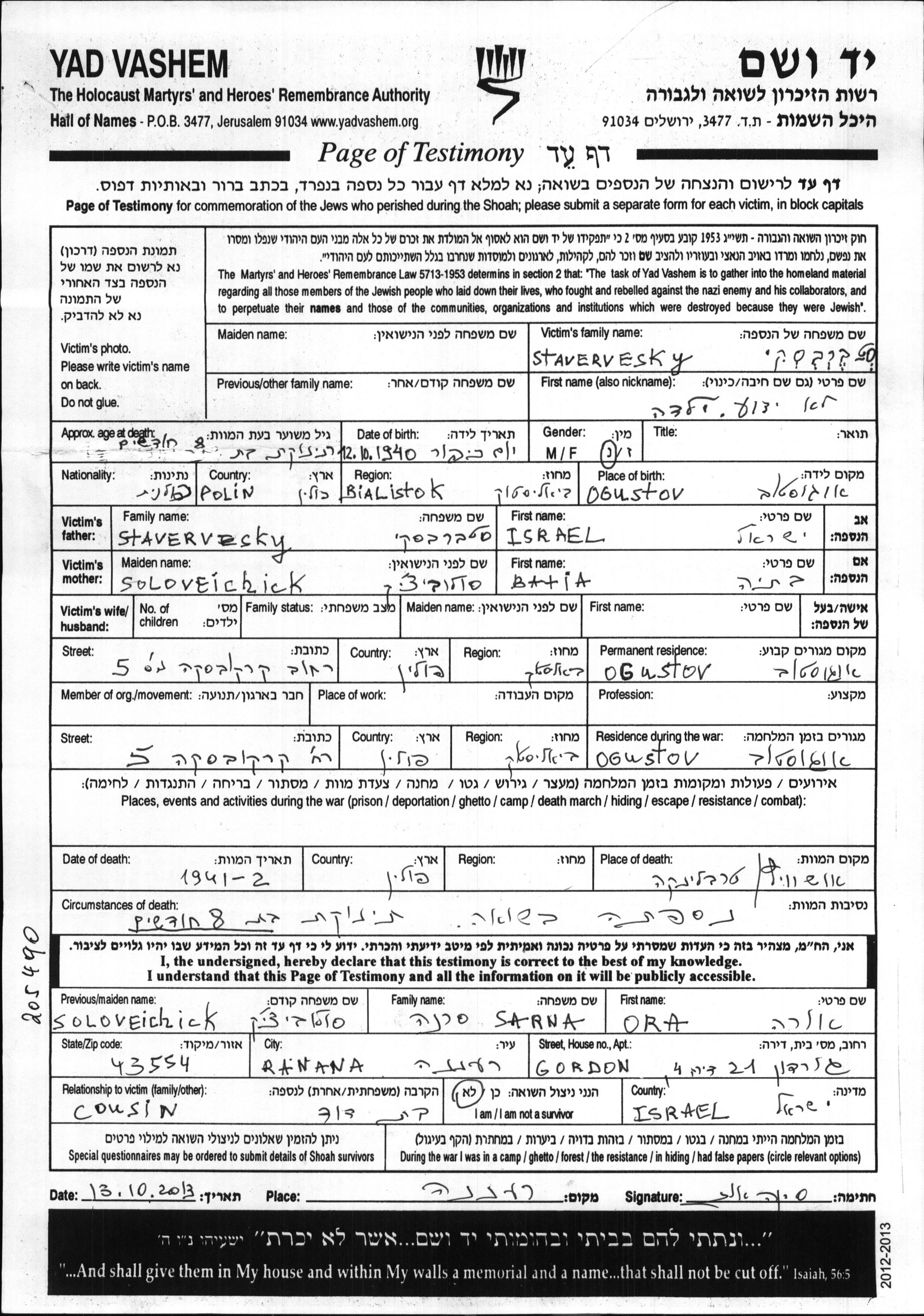 Vorname unbekannt Stavervesky wurde im Jahr 1940 in Augustów, Polen geboren. Sie war die Tochter von Israel und Batia, geb. Soloveichick. Sie war Säugling. Vor dem Zweiten Weltkrieg lebte sie in Augustów, Polen. Während des Krieges war sie in Augustów, Polen.