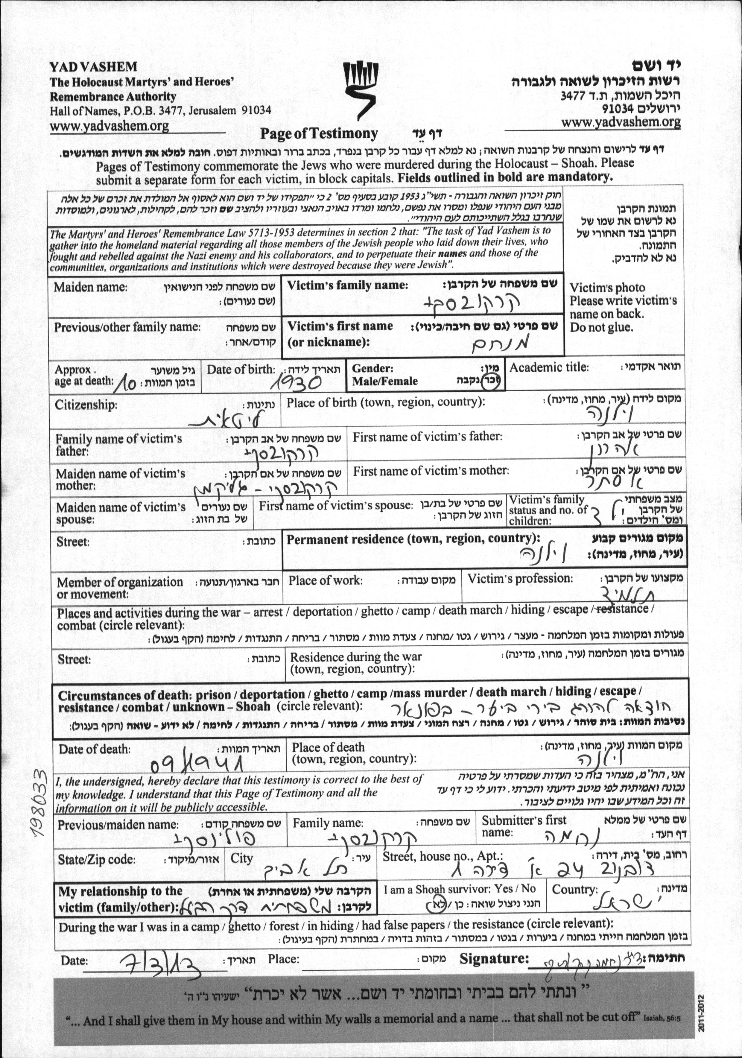 Menakhem wurde in der Schoah ermordet. Todesort: Ponari, Polen im Jahr 09/1941.