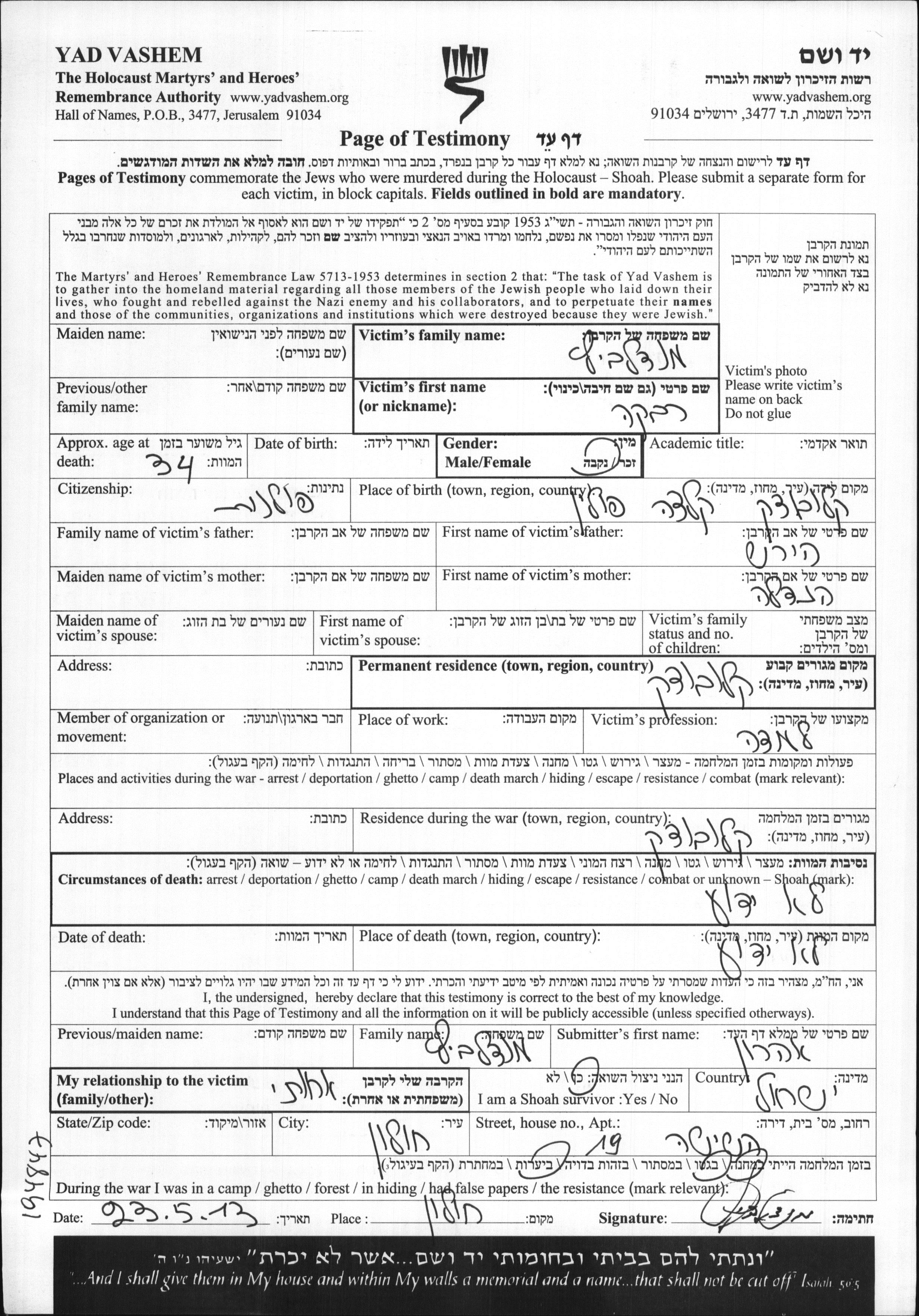 Rivka wurde in der Schoah ermordet.