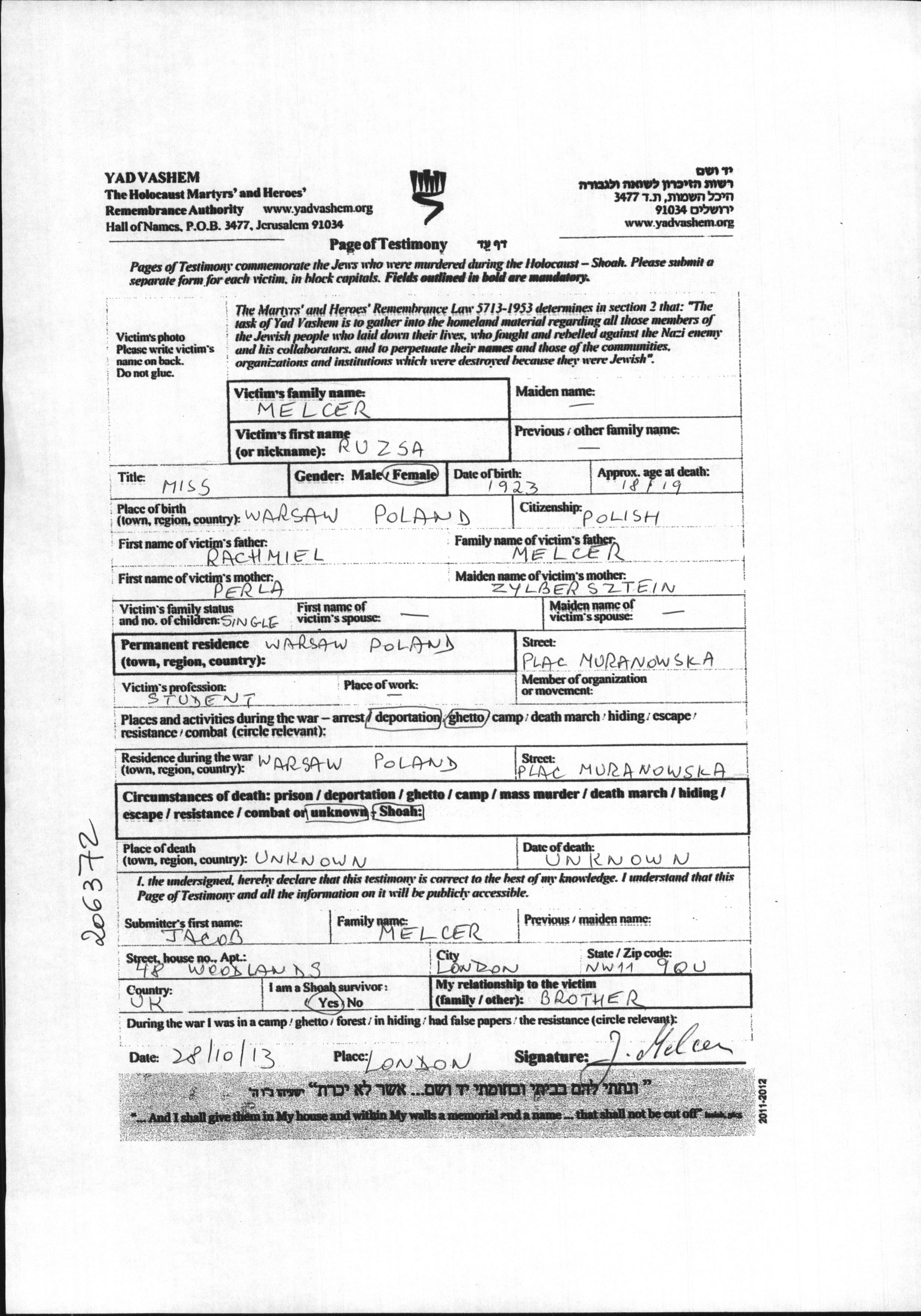 Ruzsa Melcer wurde im Jahr 1923 in Warszawa, Polen geboren. Sie war die Tochter von Rachmiel und Perla, geb. Zylbersztein. Sie war Student und Ledig. Vor dem Zweiten Weltkrieg lebte sie in Warszawa, Polen.