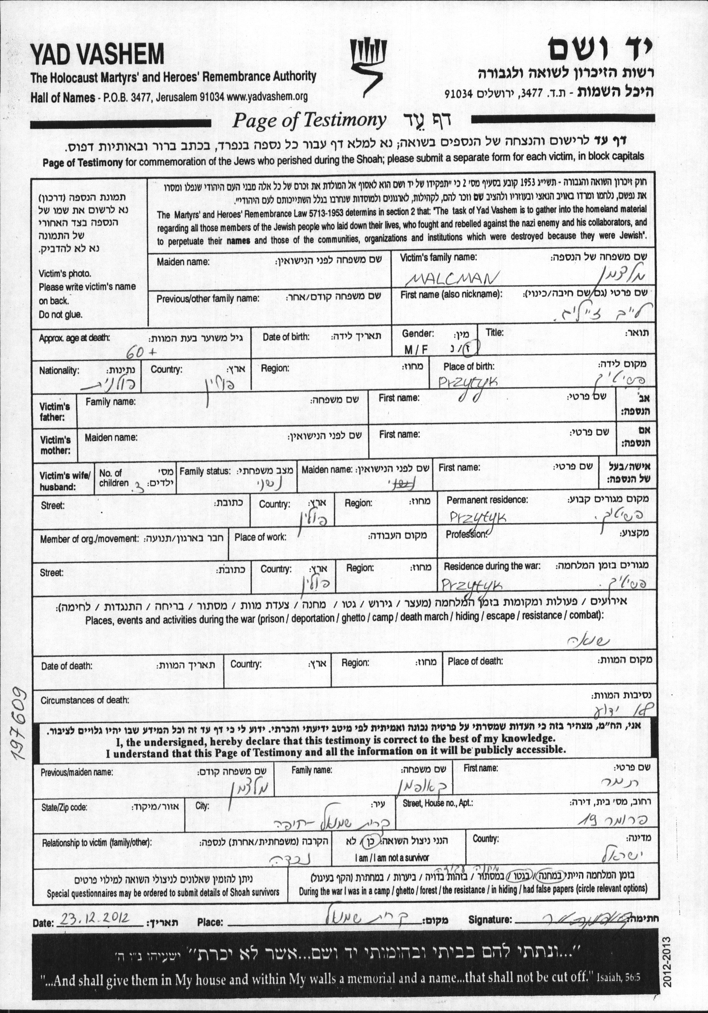 Leib Zeilig Malcman wurde in Przytyk, Polen geboren. Er war Verheiratet. Vor dem Zweiten Weltkrieg lebte er in Przytyk, Polen. Während des Krieges war er in Przytyk, Polen.