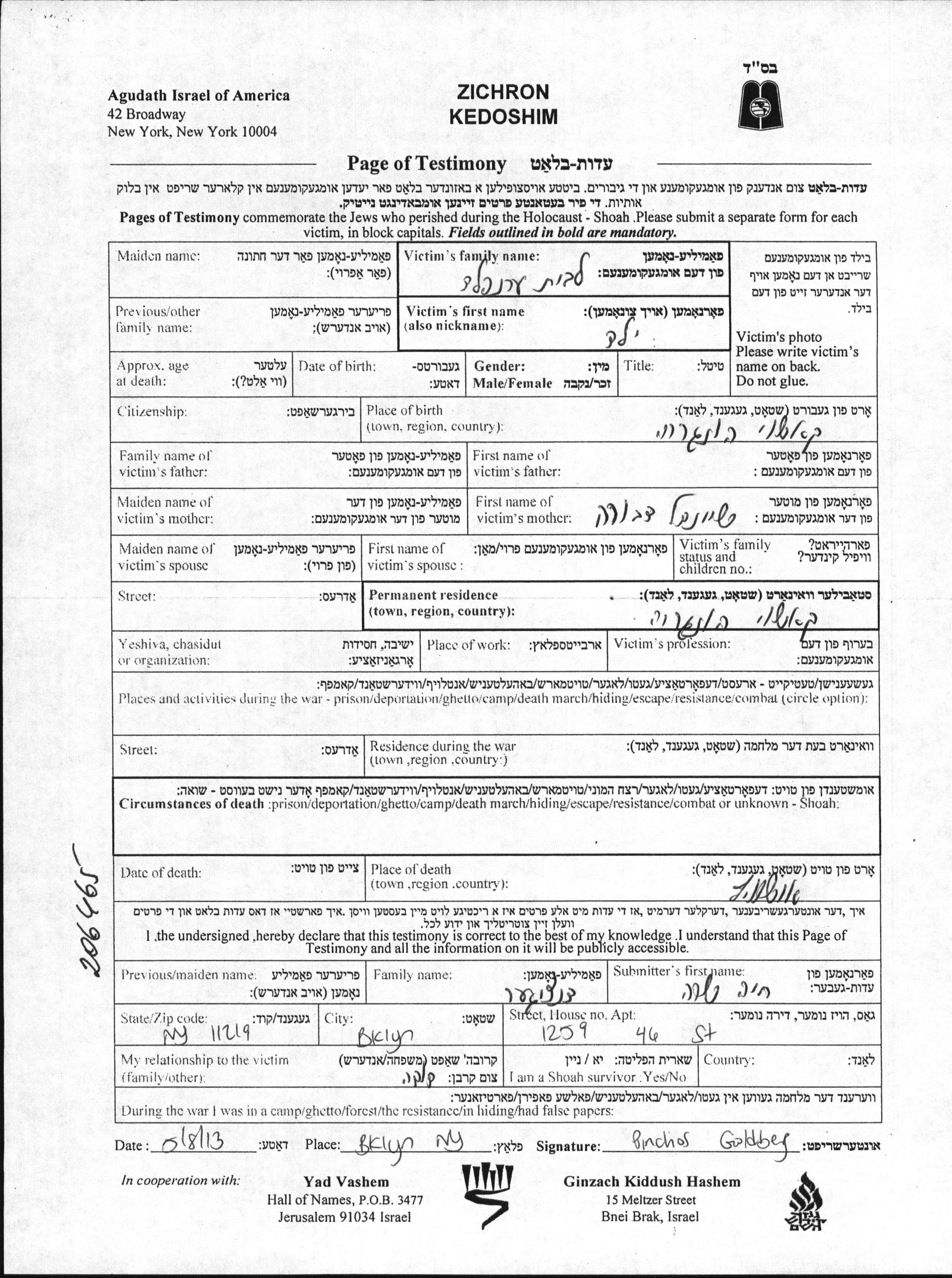 Vorname unbekannt Ehrenfeld wurde in Kassa, Ungarn geboren. Er/sie war der/ die Sohn/Tochter von Sheindl Dvora. Vor dem Zweiten Weltkrieg er/sie in Kassa, Ungarn.