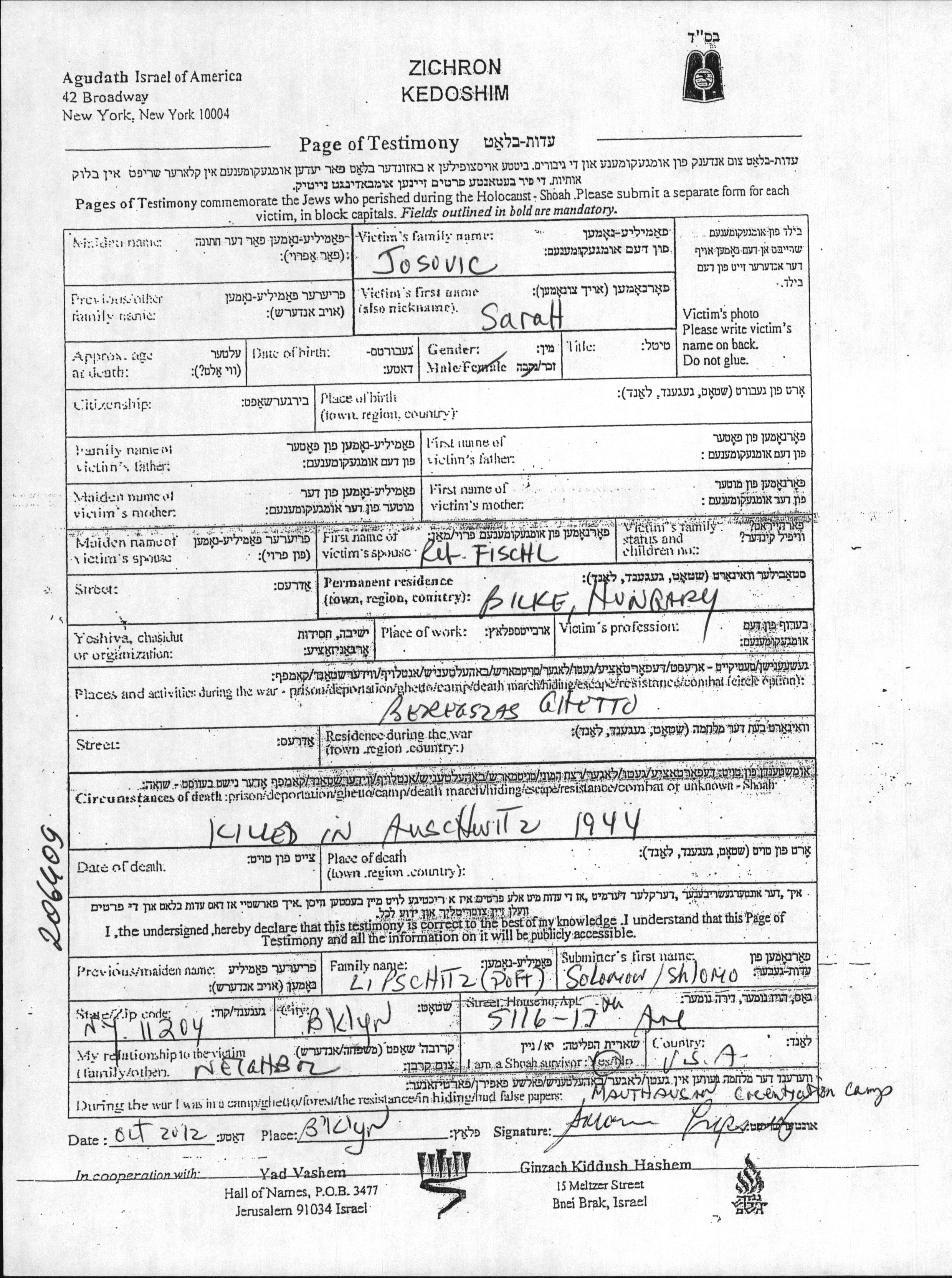 Sarah Josovic. Sie war mit Fishl Verheiratet. Vor dem Zweiten Weltkrieg lebte sie in Bilke, Tschechoslowakei. Während des Krieges war sie in Beregszasz, Tschechoslowakei.