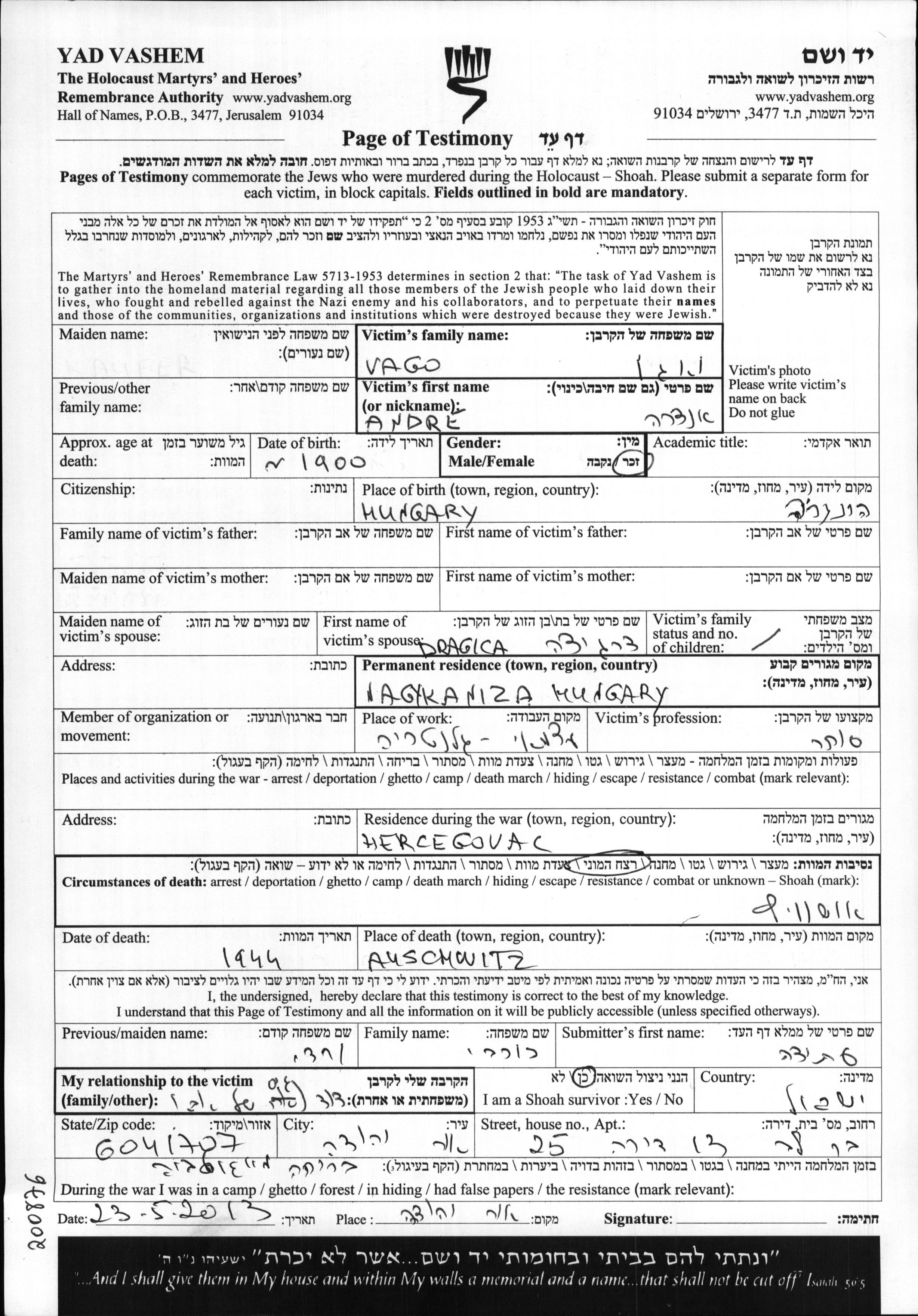 Andre Andree Vago wurde im Jahr 1900 in Ungarn geboren. Er war Kaufmann/-frau und mit Dragica Verheiratet. Vor dem Zweiten Weltkrieg lebte er in Nagykanizsa, Ungarn. Während des Krieges war er in Hercegovac, Jugoslawien.