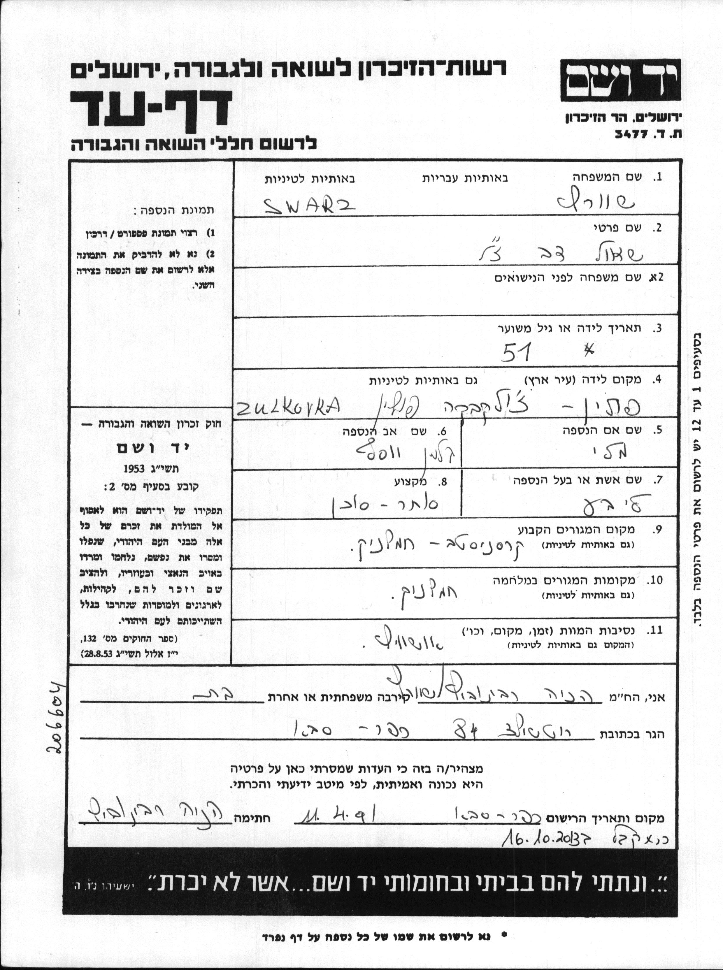 Shaul Dov Swarz wurde in Zulkowka, Polen geboren. Er war der Sohn von Joseph Kalman und Mali. Er war Kaufmann/-frau und mit Libe Verheiratet. Vor dem Zweiten Weltkrieg lebte er in Krasnystaw, Polen. Während des Krieges war er in Chmielnik, Polen.