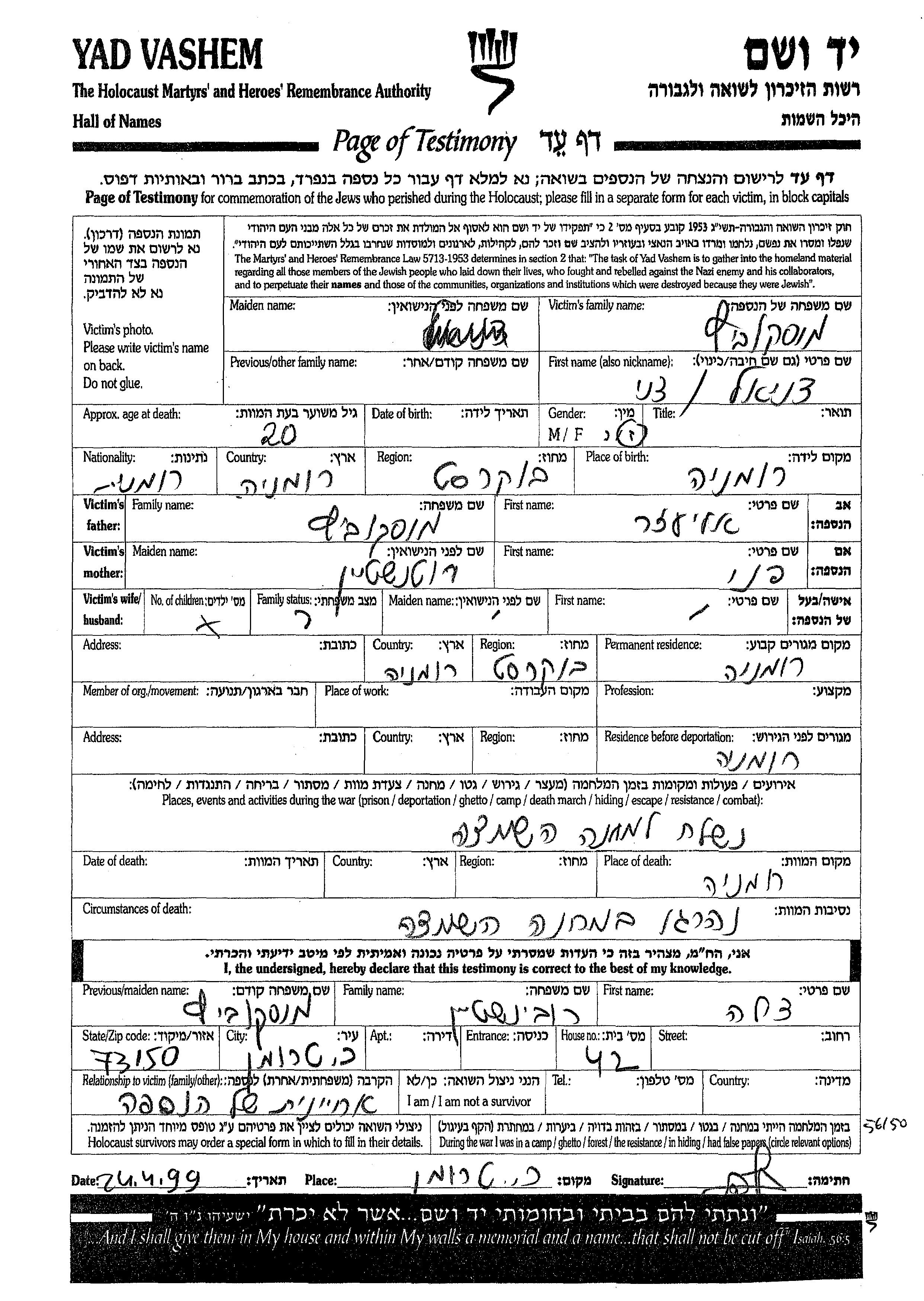 Daniel Moskovich wurde in Bukarest, Rumänien geboren. Er war der Sohn von Eliezer und Fani. Er war Ledig. Vor dem Zweiten Weltkrieg lebte er in Bukarest, Rumänien. Während des Krieges war er in Rumänien.
