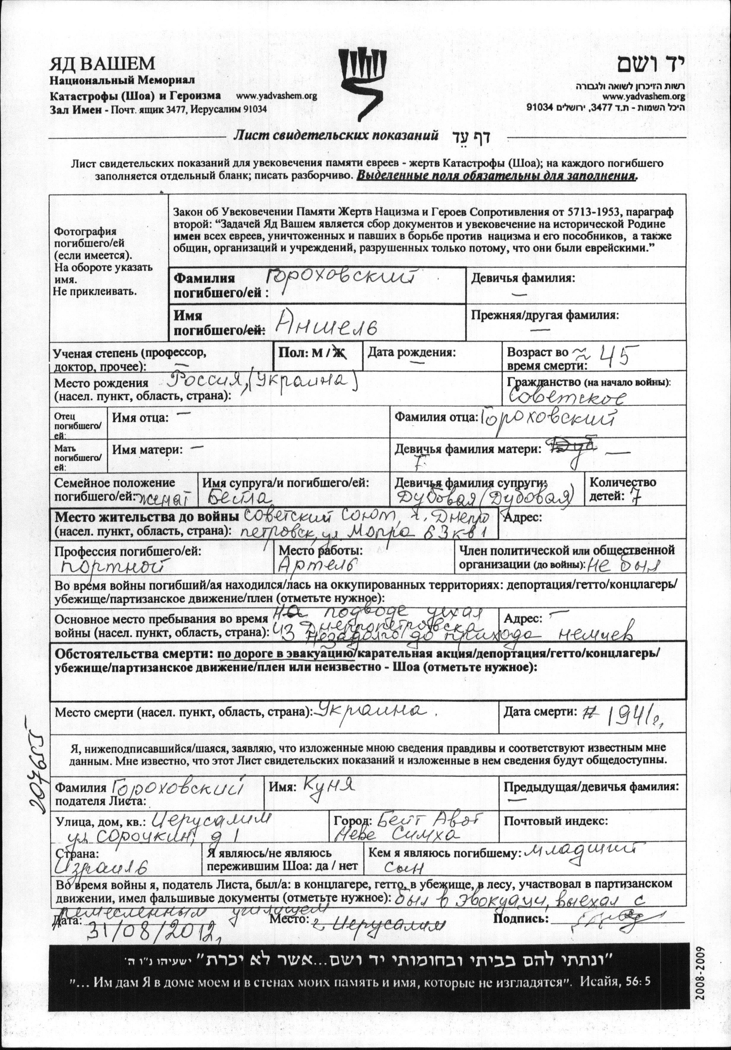 Anshel Gorokhovskiy wurde in Ukraine (UdSSR) geboren. Er war Schneider und mit Beyla, geb. Dubovaya Verheiratet. Vor dem Zweiten Weltkrieg lebte er in Dnepropetrovsk, Ukraine (UdSSR). Während des Krieges war er in Ukraine (UdSSR).
