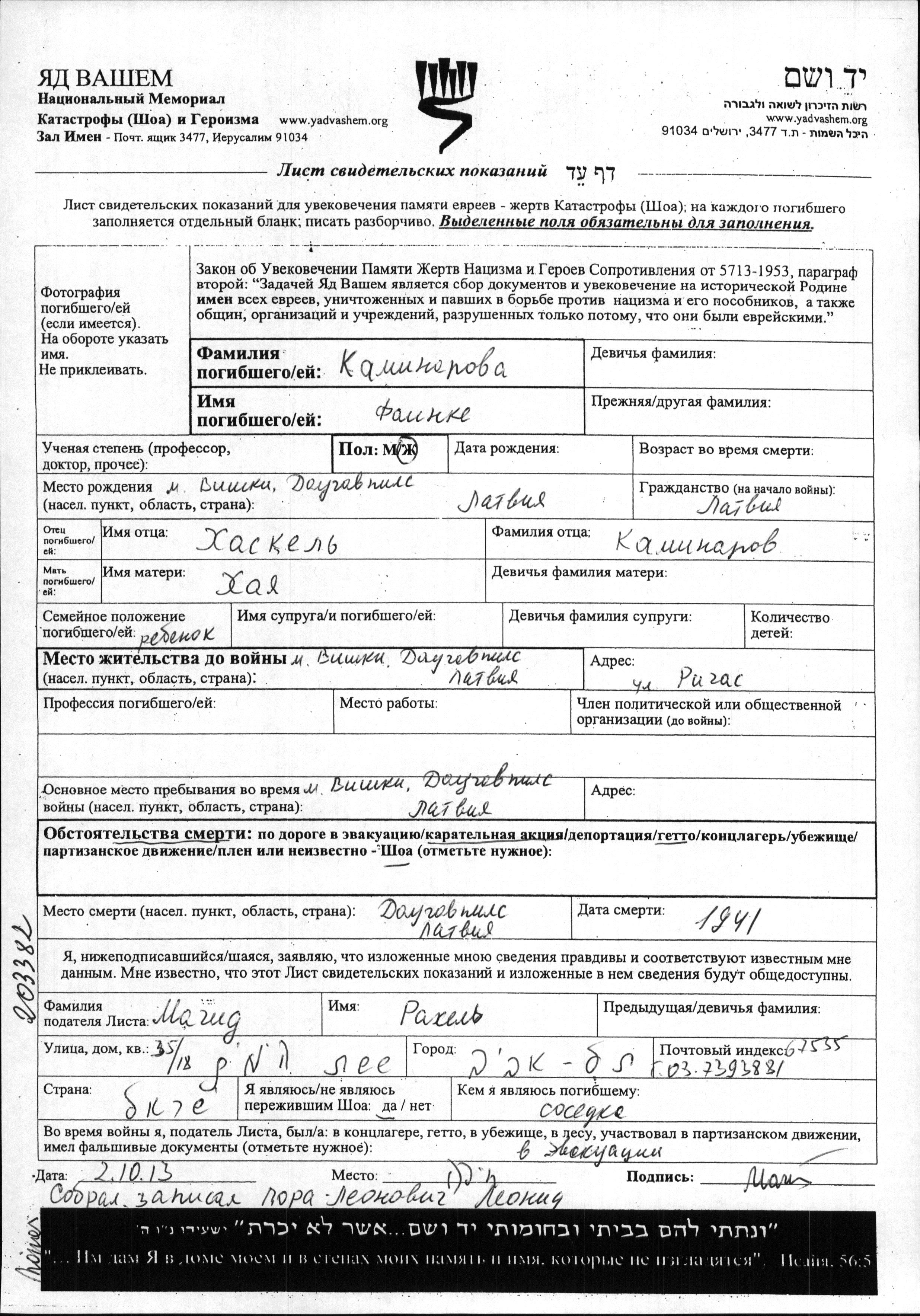 Fainke Kaminarova wurde in Viski, Lettland geboren. Sie war die Tochter von Khaskel und Khaya. Sie war Kind. Vor dem Zweiten Weltkrieg lebte sie in Viski, Lettland. Während des Krieges war sie in Getto.