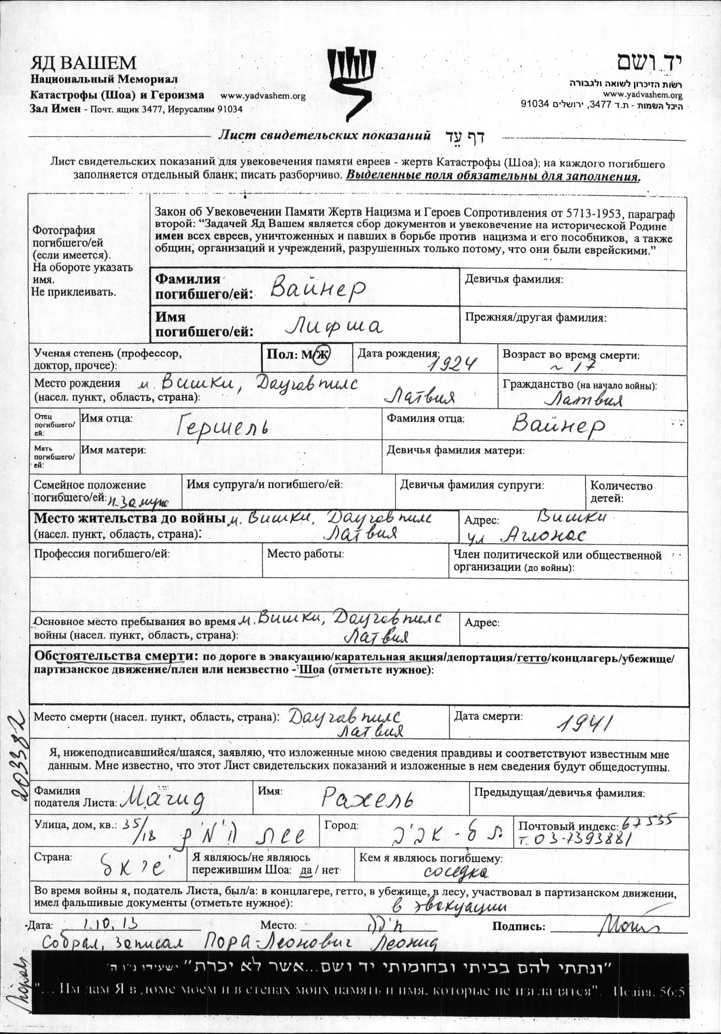 Lifsha Vayner wurde im Jahr 1924 in Viski, Lettland geboren. Sie war die Tochter von Gershel. Sie war Jugendliche/-r. Vor dem Zweiten Weltkrieg lebte sie in Viski, Lettland. Während des Krieges war sie in Getto.