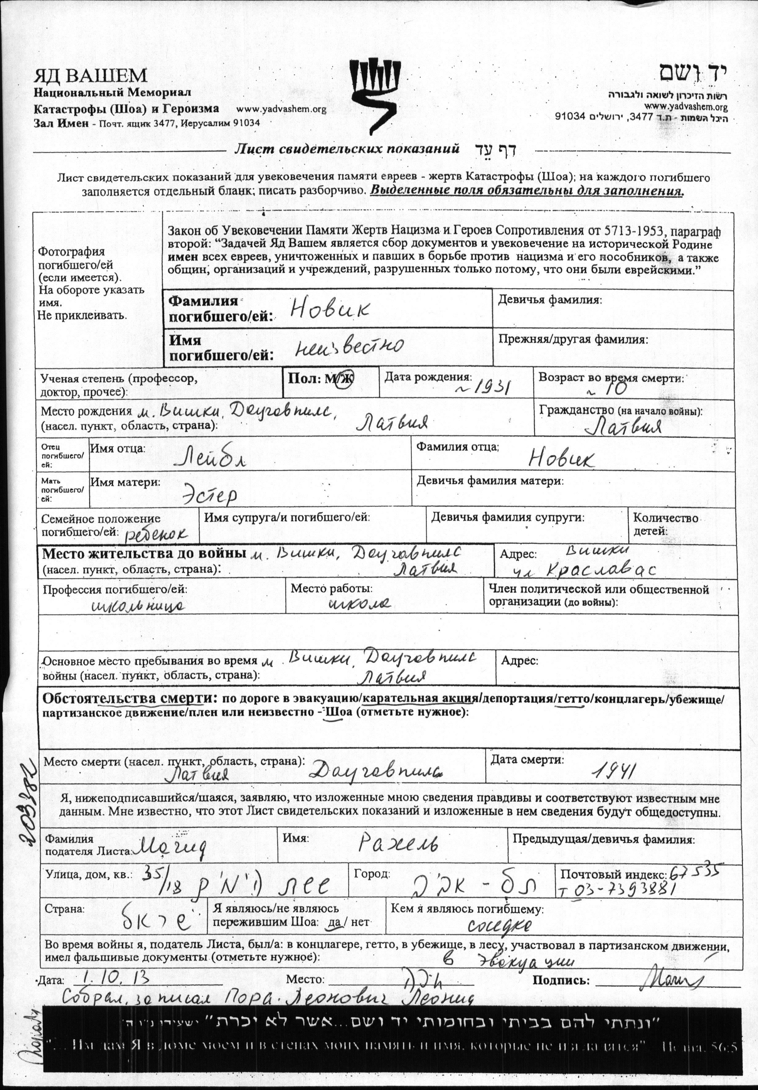 Vorname unbekannt Novik wurde im Jahr 1931 in Viski, Lettland geboren. Sie war die Tochter von Leybl und Ester. Sie war Schulmädchen und Kind. Vor dem Zweiten Weltkrieg lebte sie in Viski, Lettland. Während des Krieges war sie in Getto.