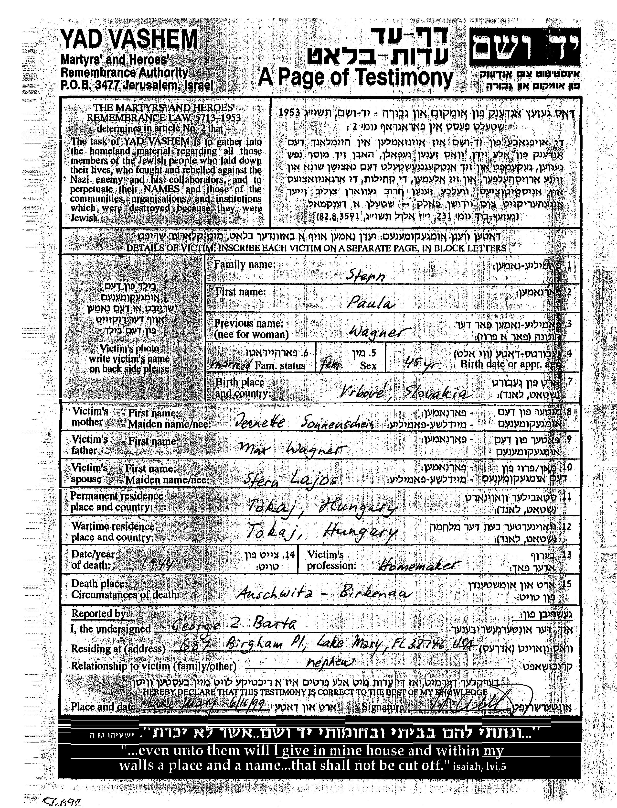 Paula Stern, geb. Wagner wurde in Vrbovce, Tschechoslowakei geboren. Sie war die Tochter von Max und Jeanette. Sie war Hausfrau und mit Lajos Verheiratet. Vor dem Zweiten Weltkrieg lebte sie in Tokaj, Ungarn. Während des Krieges war sie in Tokaj, Ungarn.