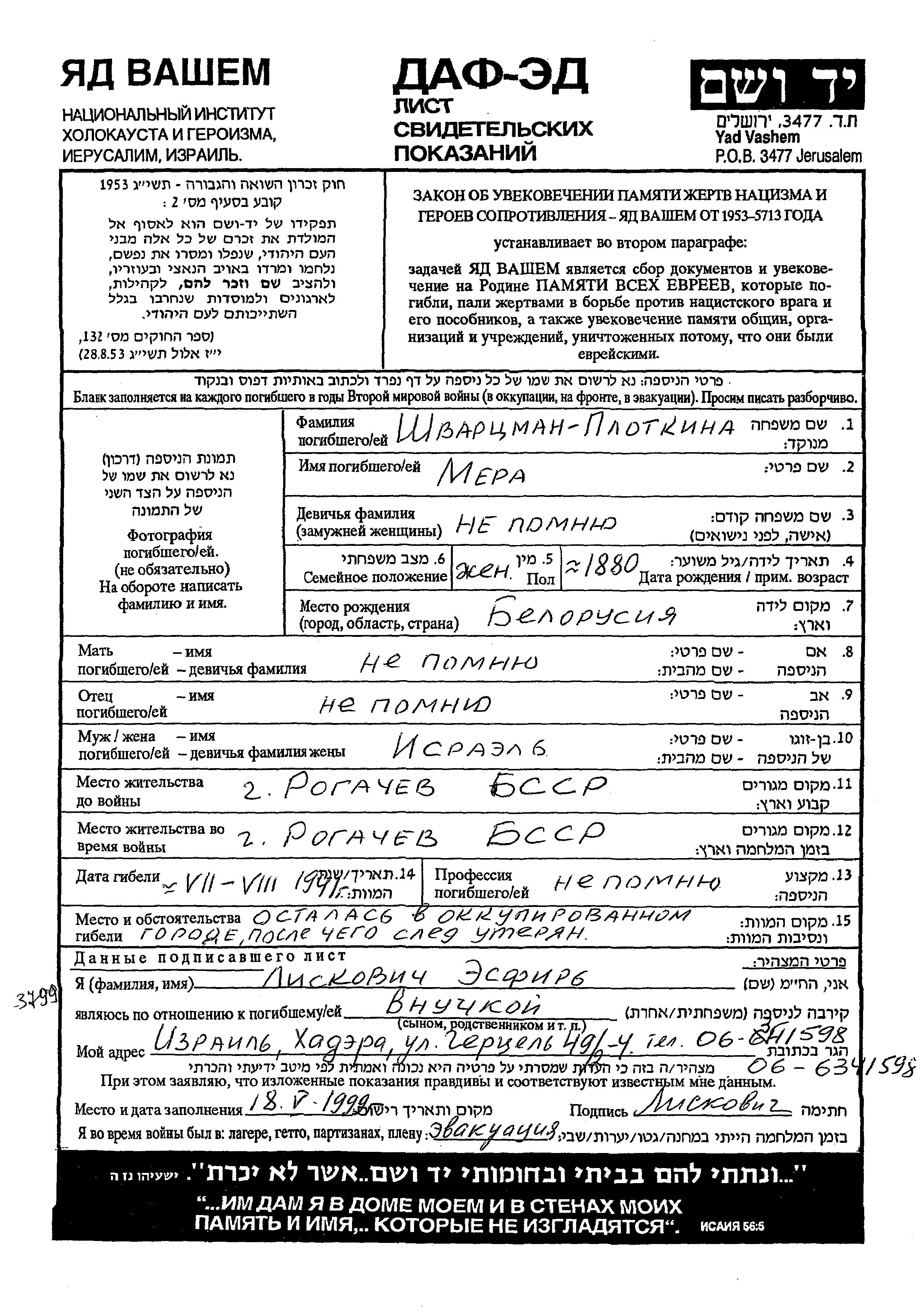 Mera Shvartzman Plotkin wurde im Jahr 1880 in Weißrussland (UdSSR) geboren. Vor dem Zweiten Weltkrieg lebte sie in Rogachev. Während des Krieges war sie in Rogachev.