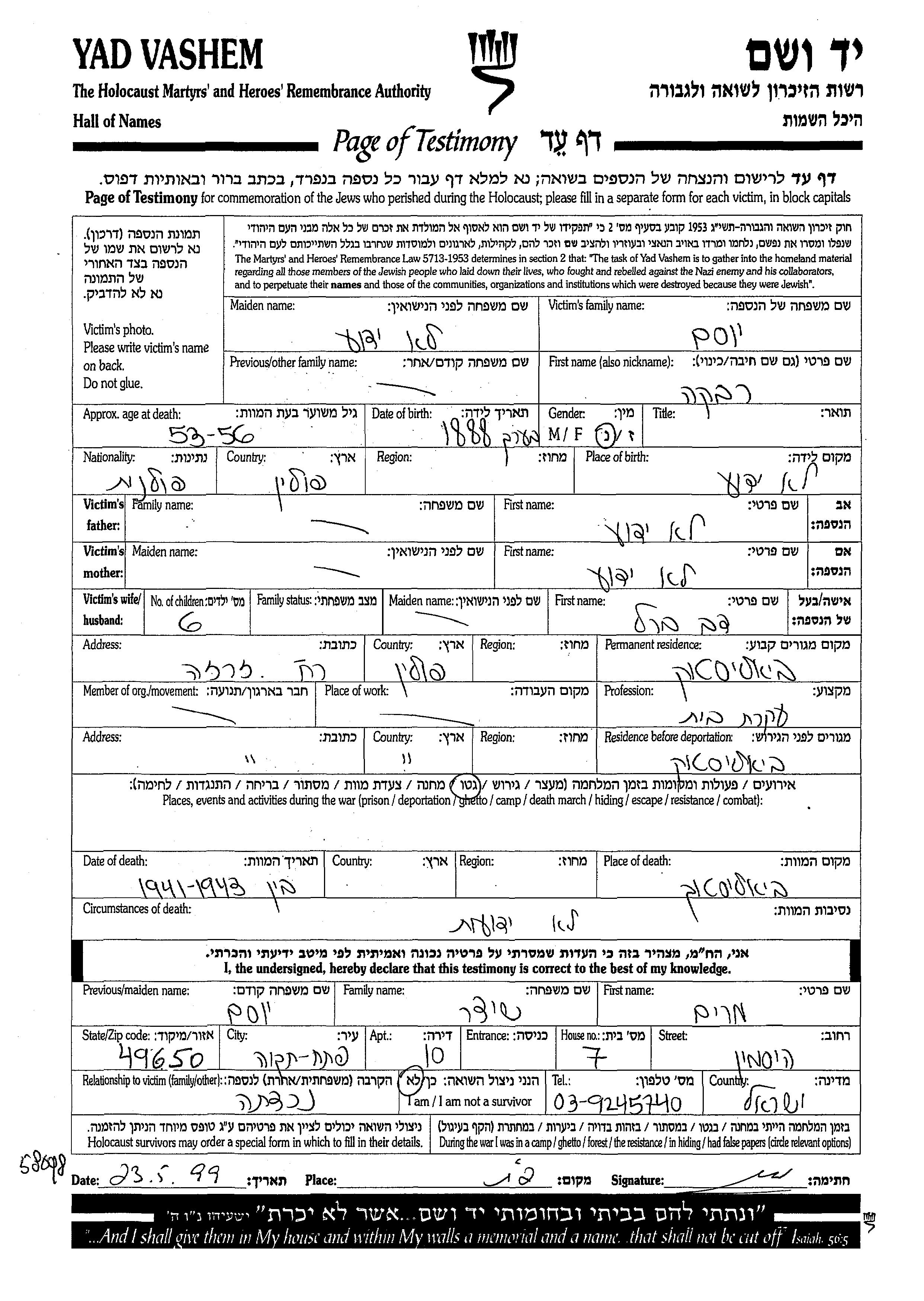 Rivka Iosem wurde im Jahr 1888 in Polen geboren. Sie war Hausfrau und mit Dov Berl Verheiratet. Vor dem Zweiten Weltkrieg lebte sie in Bialistok, Polen. Während des Krieges war sie in Bialistok, Polen.