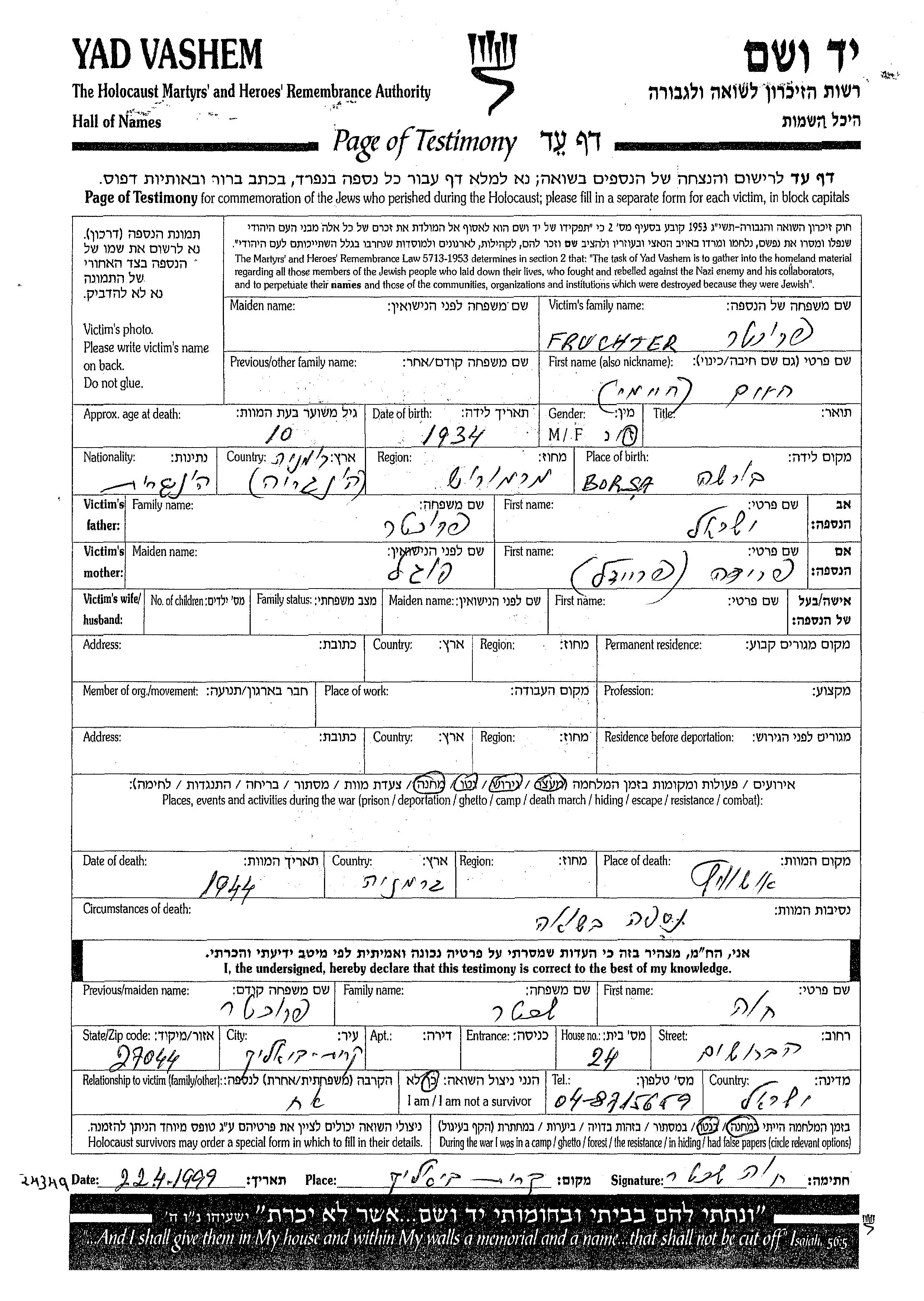 Fruchter Khaim 1934 unbekannter Ort, Gedenkblatt