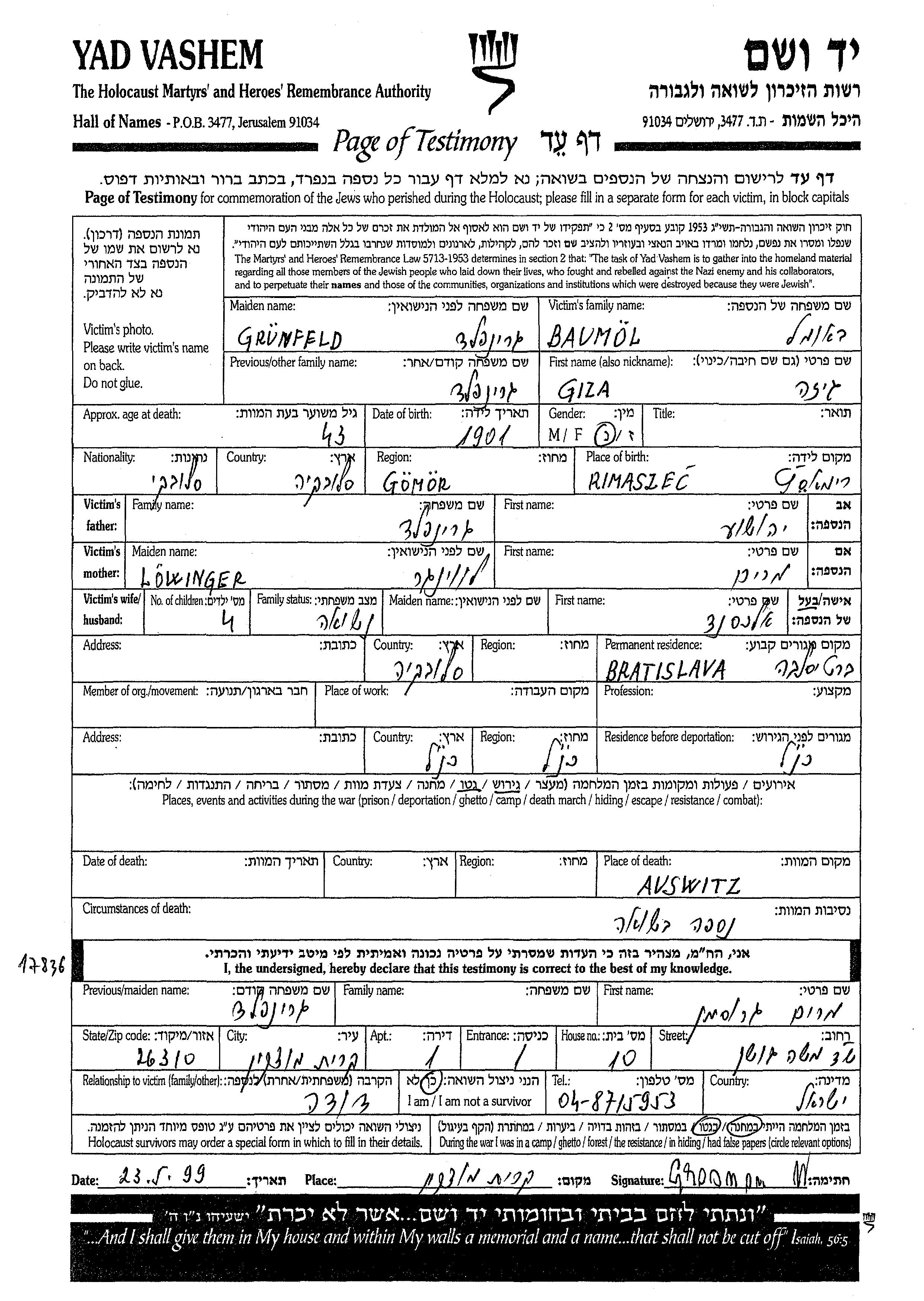 Giza Baumol, geb. Grunfeld wurde im Jahr 1901 in Rimaszecs, Tschechoslowakei geboren. Sie war die Tochter von Yehoshua und Miriam. Sie war mit Aleksander Verheiratet. Vor dem Zweiten Weltkrieg lebte sie in Bratislava, Tschechoslowakei. Während des Krieges war sie in Bratislava, Tschechoslowakei.