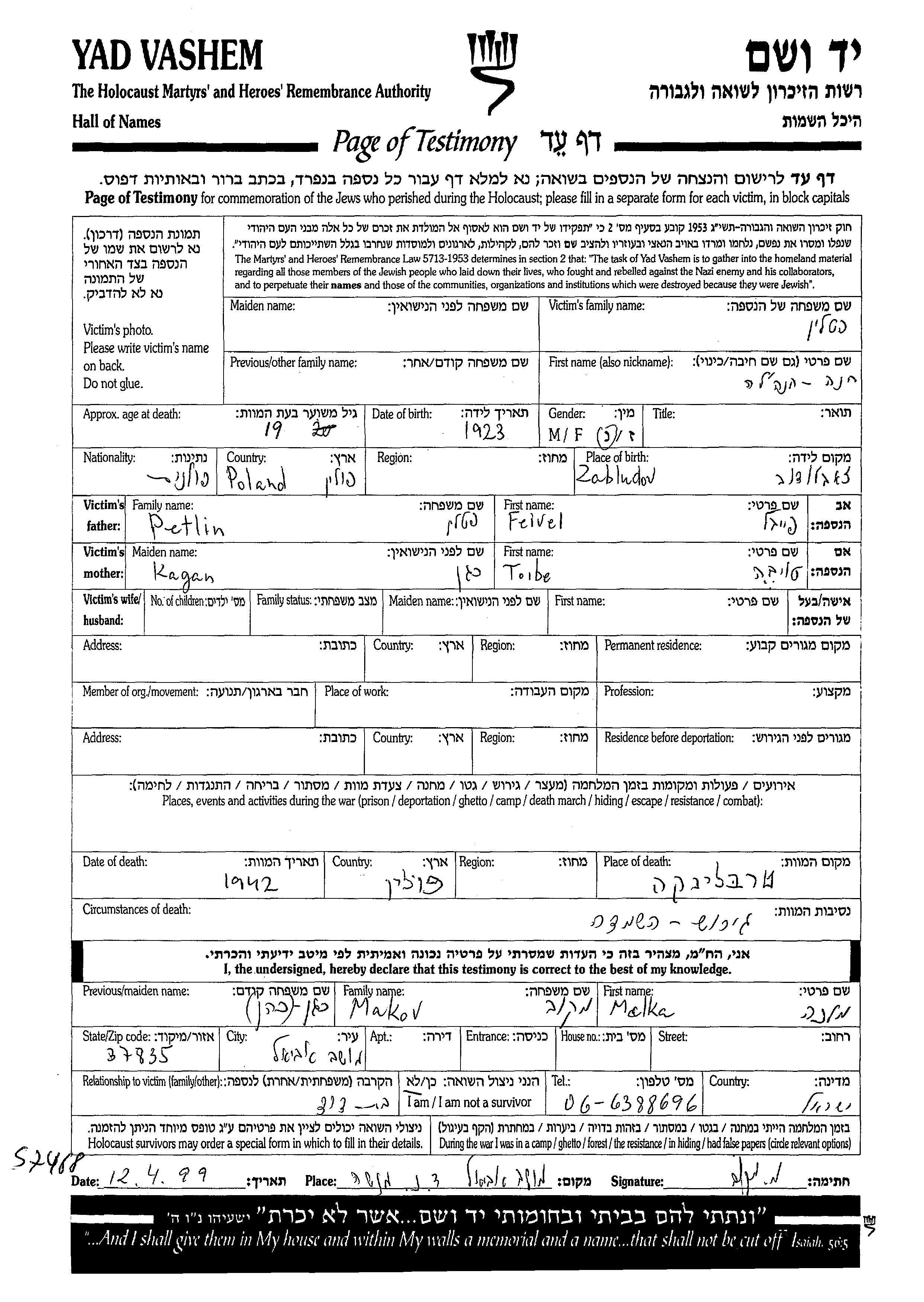 Khana Peltin wurde im Jahr 1923 in Zabludove, Polen geboren. Sie war die Tochter von Faivel und Toibe.