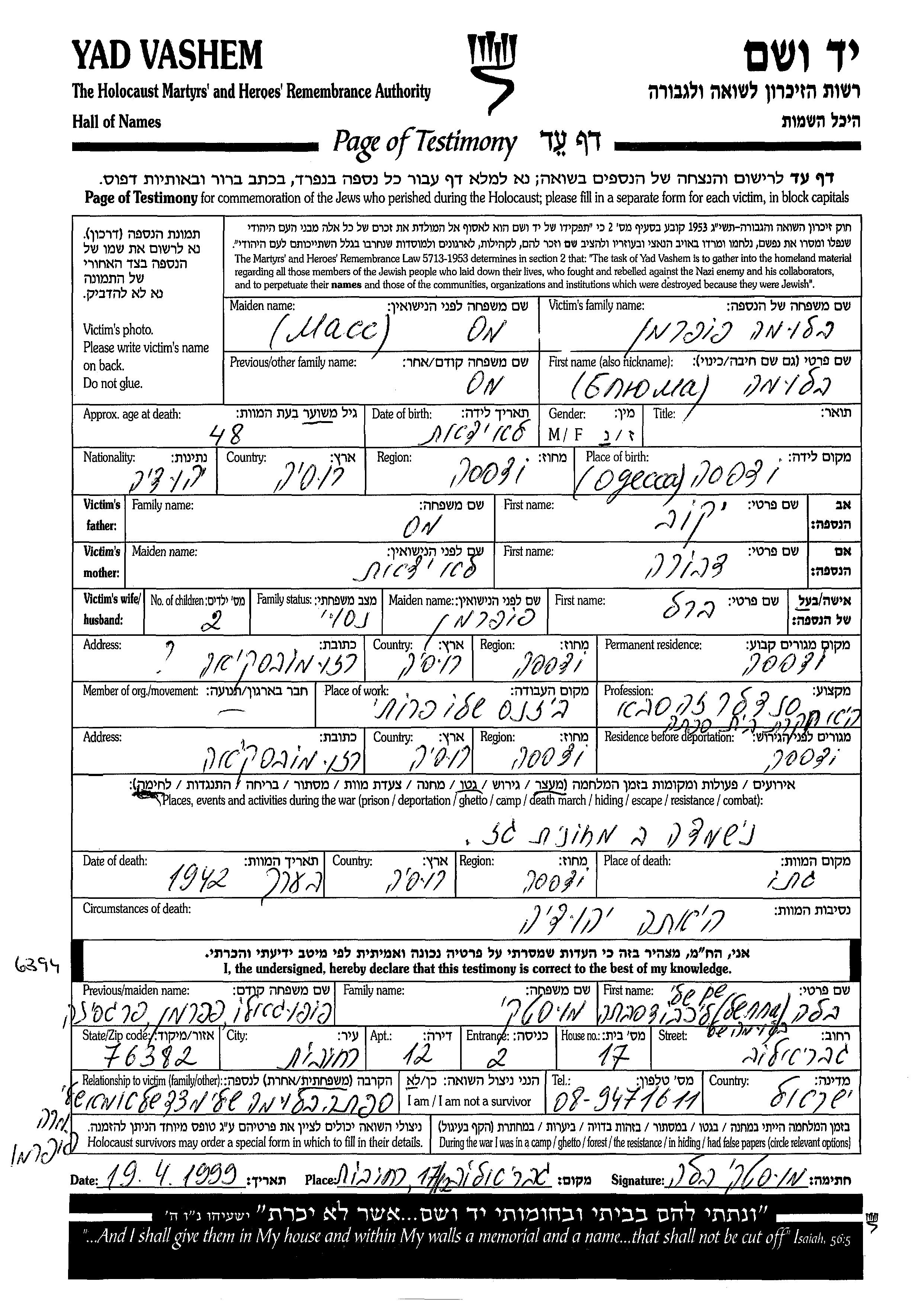 Bluma Poperman, geb. Mass wurde in Odessa, Ukraine (UdSSR) geboren. Sie war die Tochter von Yaakov und Dvora. Sie war Hausfrau und mit Berl, geb. Poperman Verheiratet. Vor dem Zweiten Weltkrieg lebte sie in Odessa, Ukraine (UdSSR). Während des Krieges war sie in Russland (UdSSR).