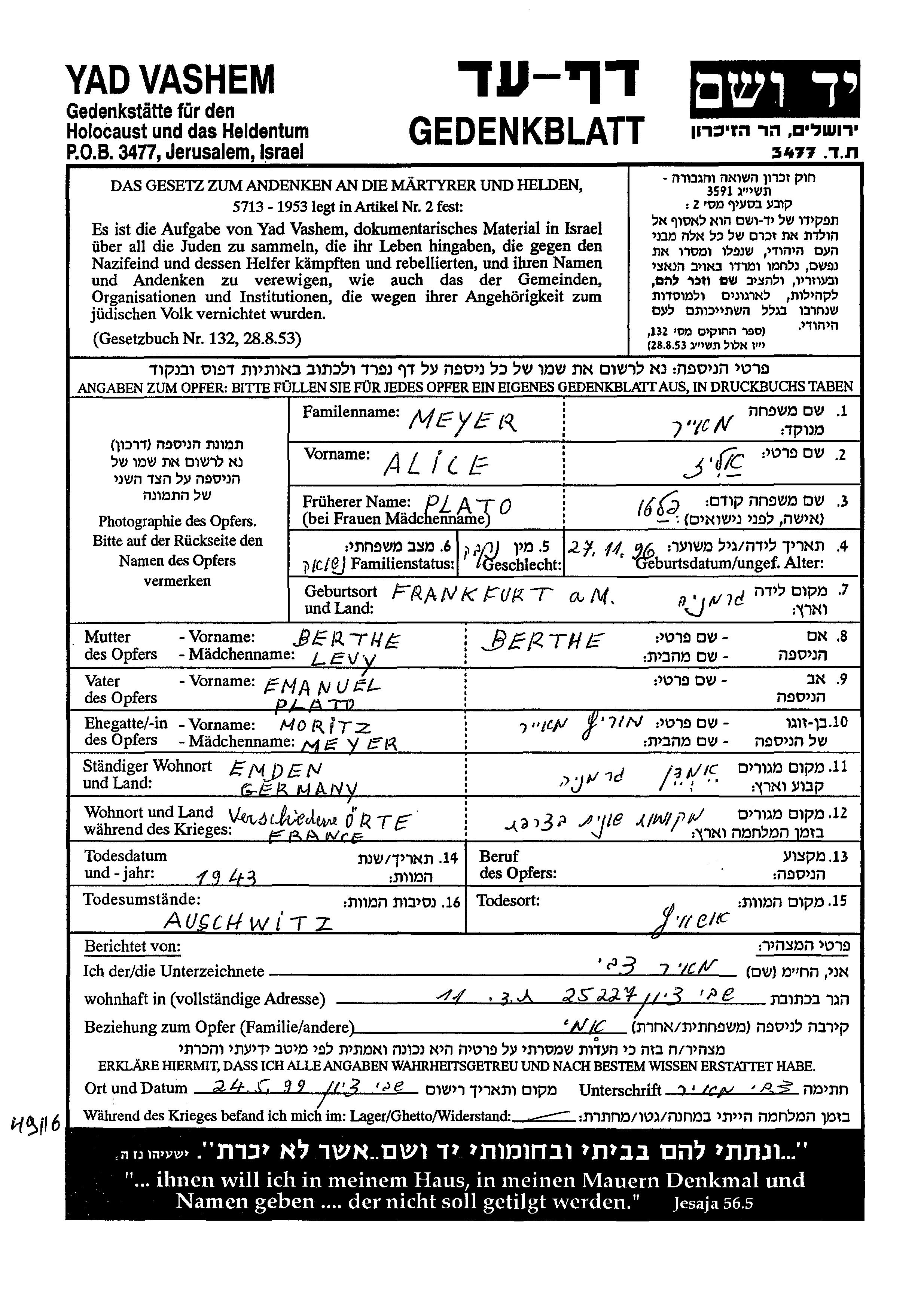 Alice Elizabeta Meyer, geb. Plato wurde im Jahr 1896 in Frankfurt, Deutsches Reich geboren. Sie war die Tochter von Emanuel und Berthe. Sie war mit Moritz Verheiratet. Vor dem Zweiten Weltkrieg lebte sie in Emden, Deutsches Reich. Während des Krieges war sie in Frankreich.