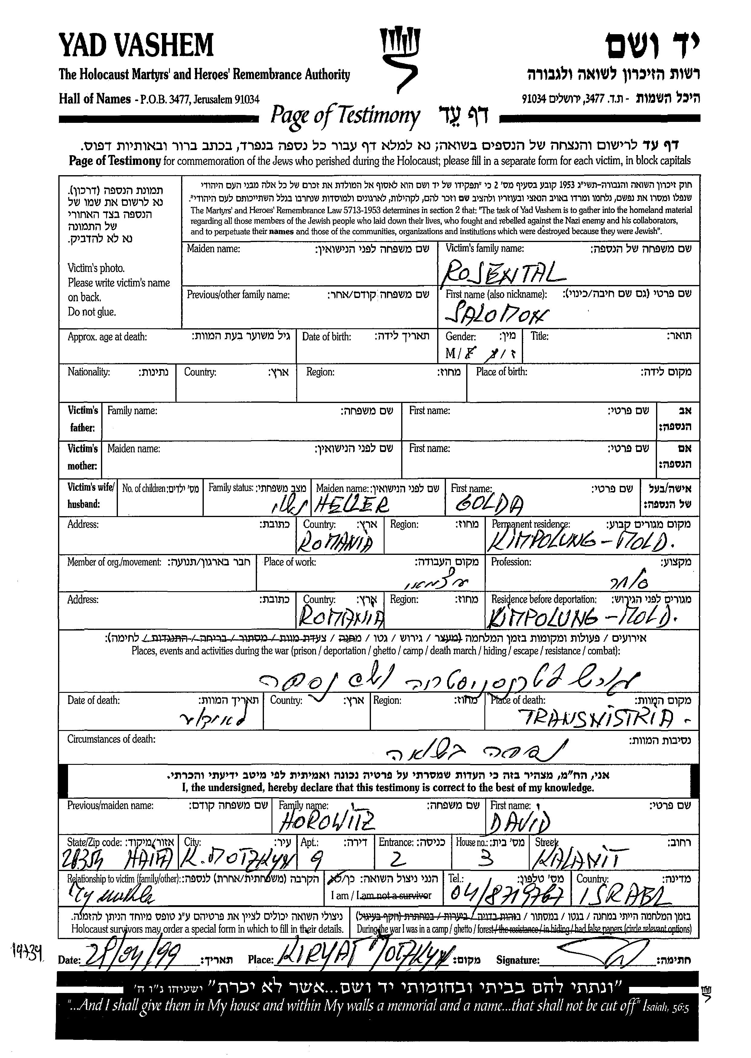 Salomon Rosental. Er war Kaufmann/-frau und mit Golda, geb. Heller Verheiratet. Vor dem Zweiten Weltkrieg lebte er in Kimpolung, Rumänien. Während des Krieges war er in Kimpulung, Rumänien.