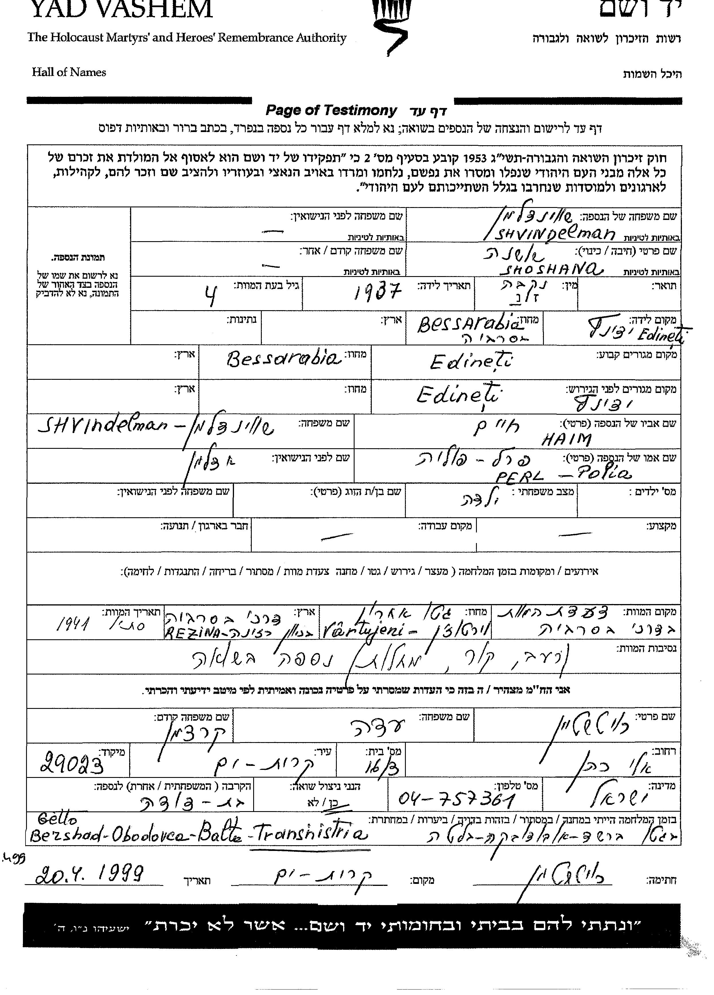Shoshana Shvindelman wurde im Jahr 1937 in Edineti, Rumänien geboren. Sie war die Tochter von Haim und Perl Polia. Sie war Kind. Vor dem Zweiten Weltkrieg lebte sie in Edineti, Rumänien. Während des Krieges war sie in Edineti, Rumänien.
