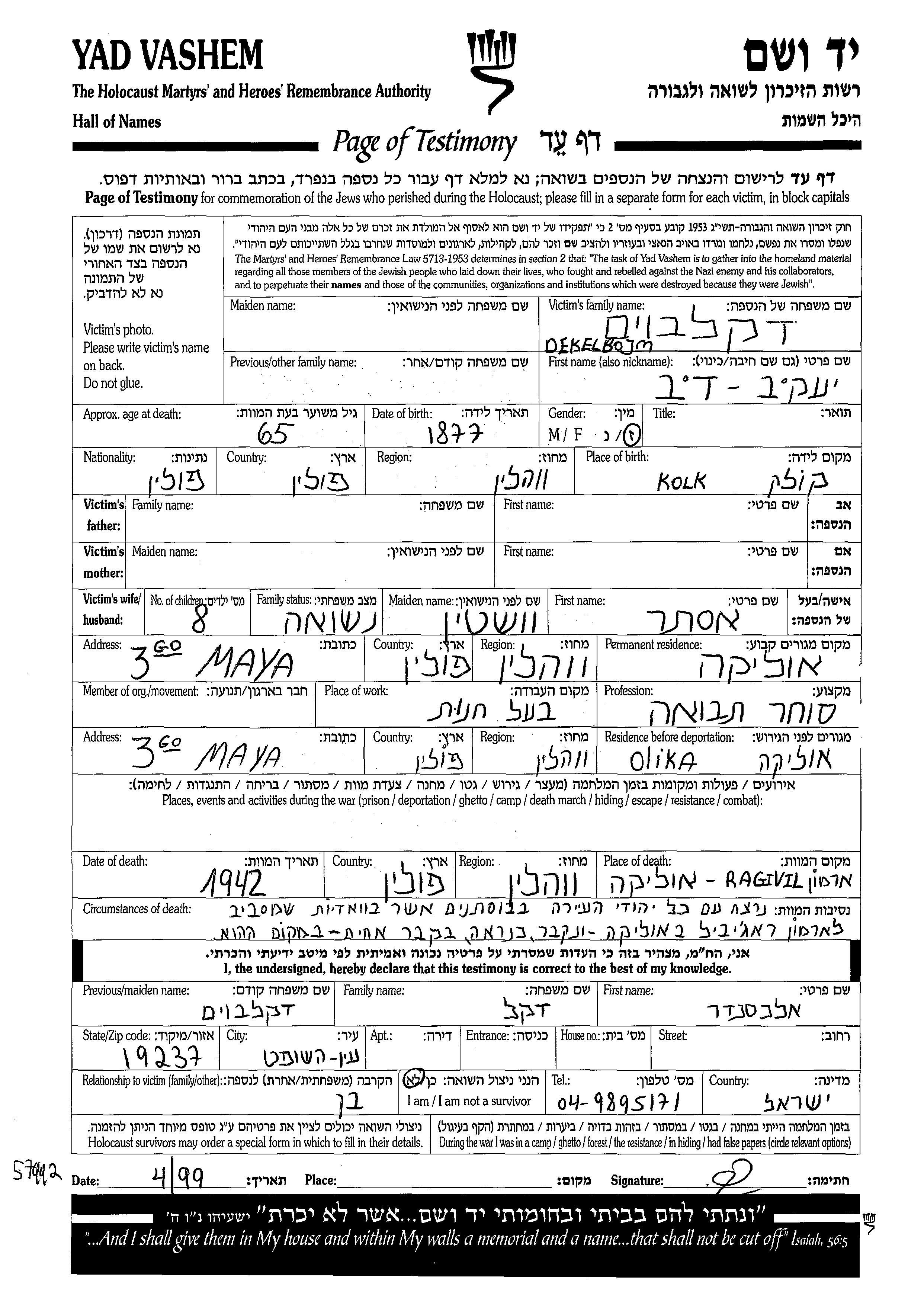 Yaakov Dov Dekelbojm wurde im Jahr 1877 in Kolka, Polen geboren. Er war Getreidehändler/-in und mit Ester, geb. Voshtin Verheiratet. Vor dem Zweiten Weltkrieg lebte er in Olika, Polen. Während des Krieges war er in Olika, Polen.