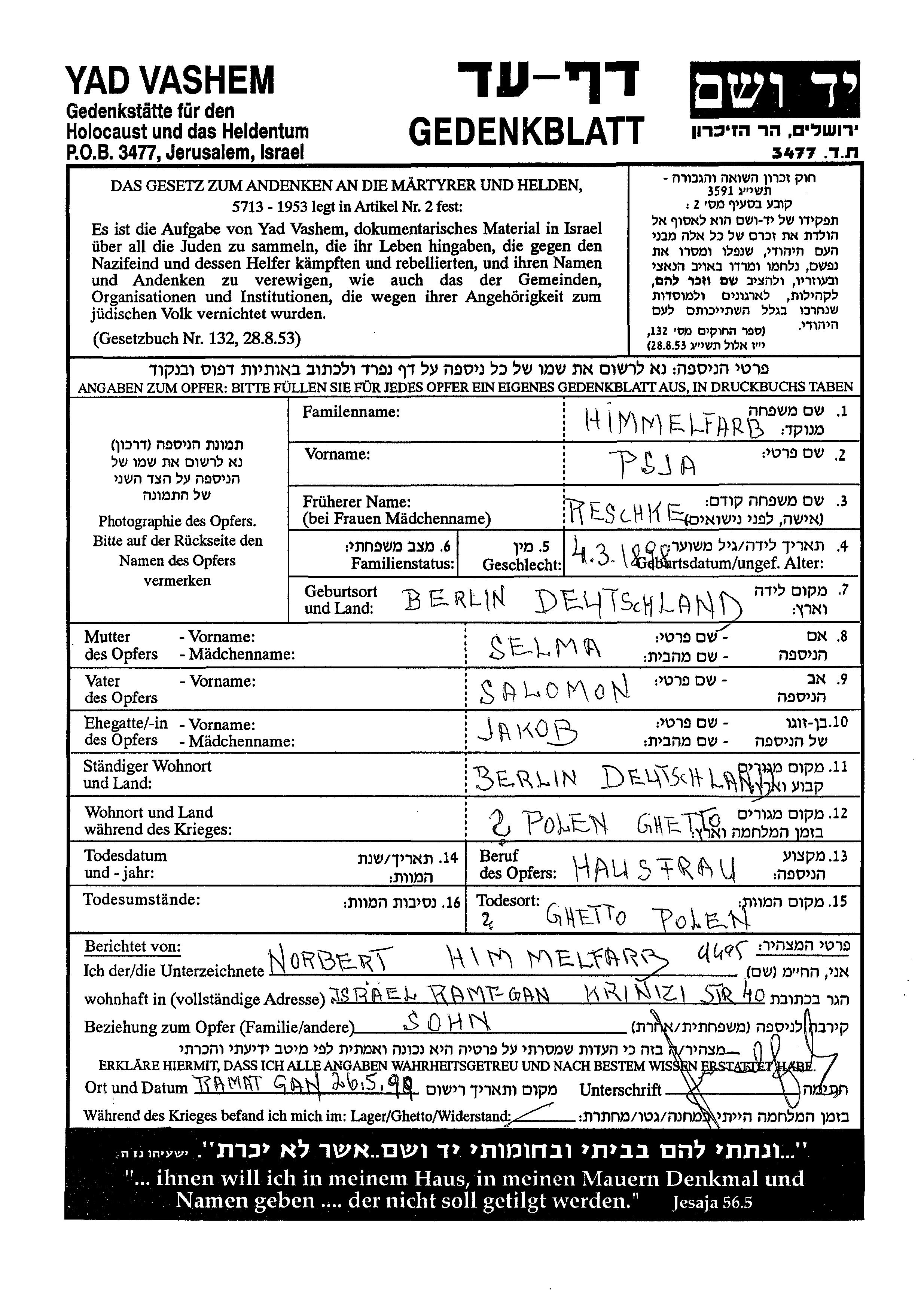 Psja Himmelfarb, geb. Reschke wurde im Jahr 1898 in Berlin, Deutsches Reich geboren. Sie war die Tochter von Salomon und Selma. Sie war Hausfrau. Vor dem Zweiten Weltkrieg lebte sie in Berlin, Deutsches Reich. Während des Krieges war sie in Polen.