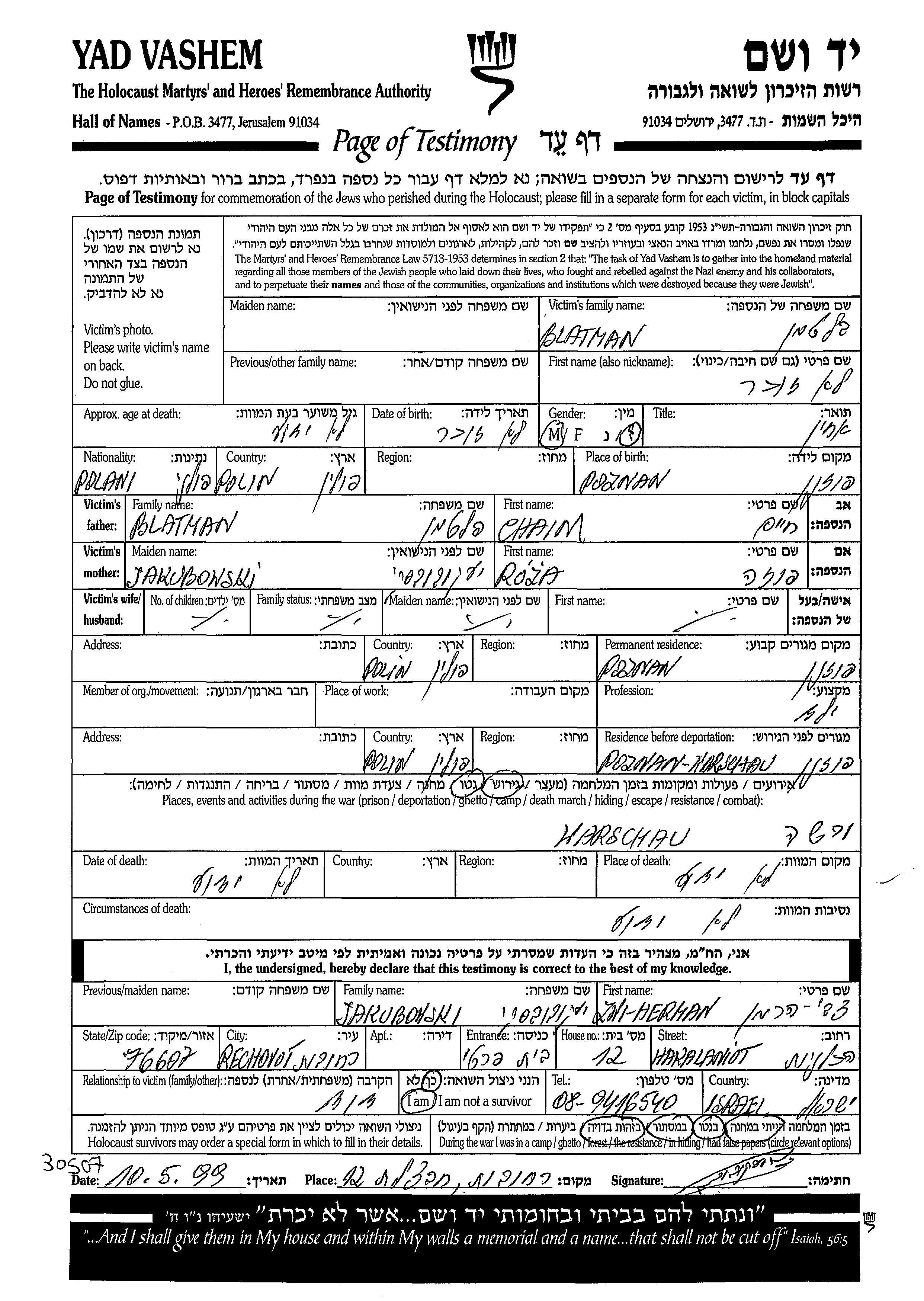 Blatman Vorname unbekannt Poznan, Polen Gedenkblatt