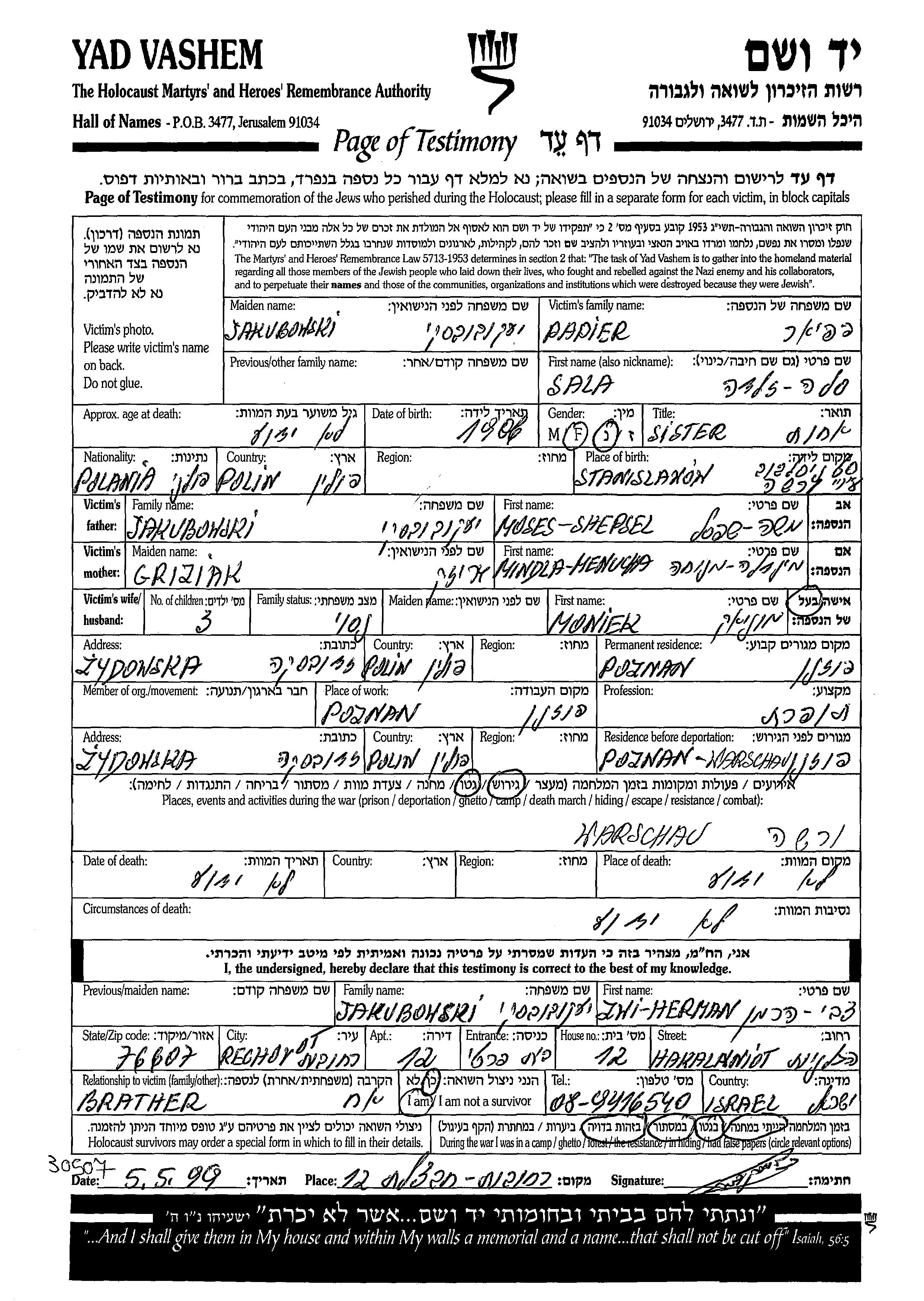 Sala Zelda Papier, geb. Jakubowski wurde im Jahr 1906 in Stanislaw, Polen geboren. Sie war die Tochter von Moses Shabtai und Mindla Menucha. Sie war Schneiderin und mit Moniek Verheiratet. Vor dem Zweiten Weltkrieg lebte sie in Poznan, Polen. Während des Krieges war sie in Poznan, Polen.
