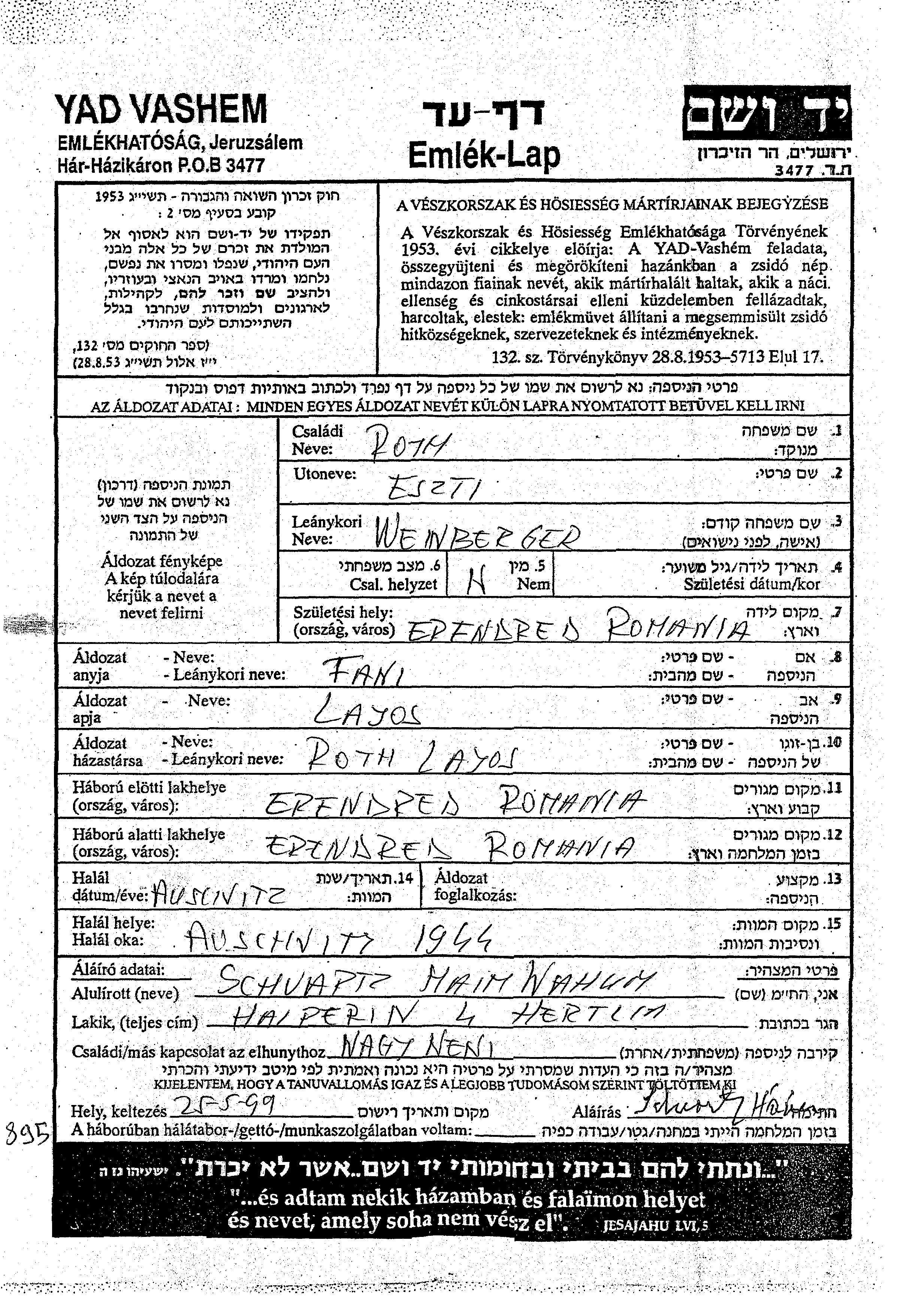 Eszti Roth, geb. Weinberger wurde in Erendred, Rumänien geboren. Sie war die Tochter von Layos und Fani. Vor dem Zweiten Weltkrieg lebte sie in Erendred, Rumänien. Während des Krieges war sie in Erendred, Rumänien.