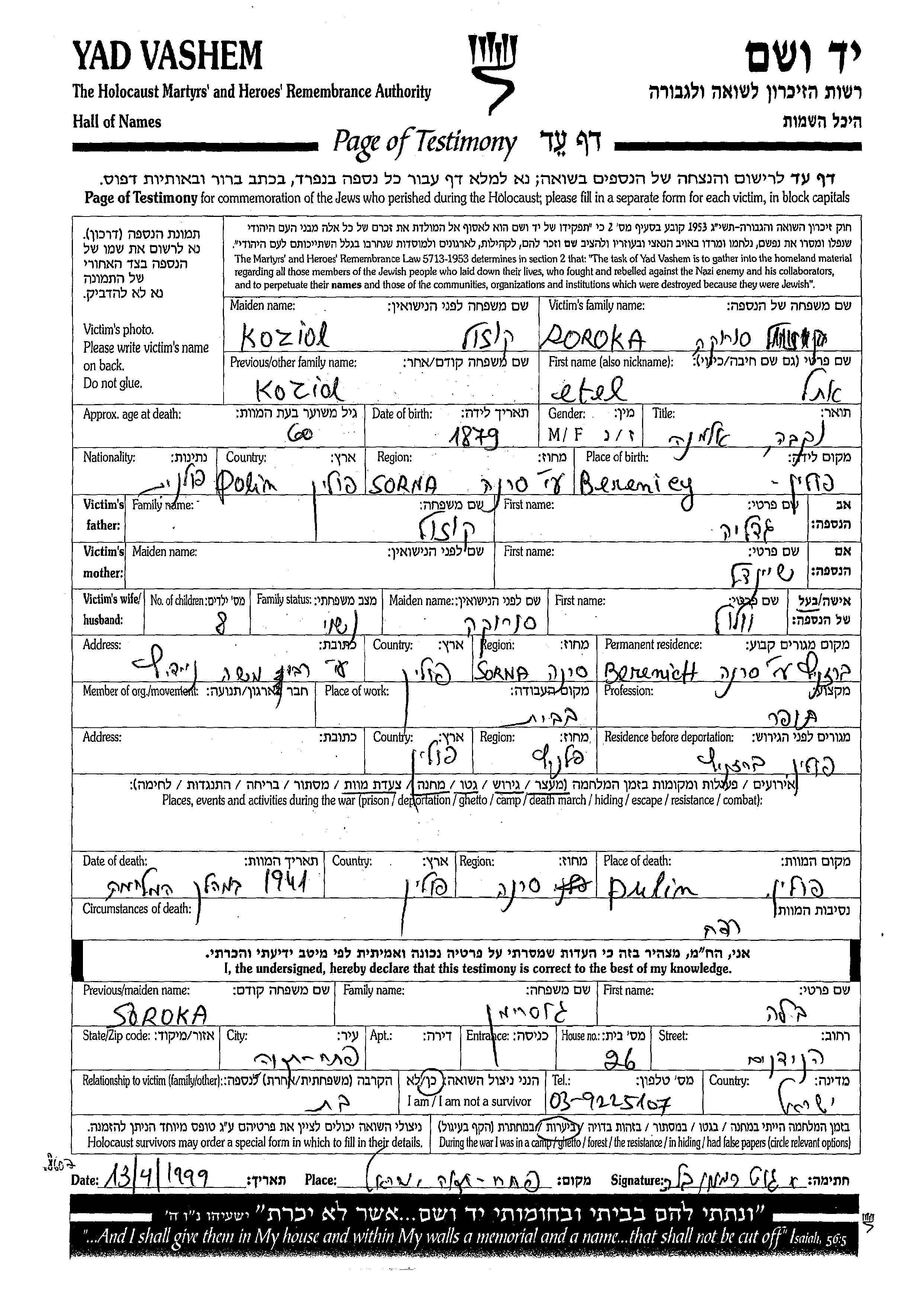 Etel Soroka, geb. Koziol wurde im Jahr 1879 in Bereznica, Polen geboren. Sie war die Tochter von Gedalia und Sheindl. Sie war Schneider und mit Volf Verheiratet. Vor dem Zweiten Weltkrieg lebte sie in Bereznica, Polen. Während des Krieges war sie in Bereznica, Polen.