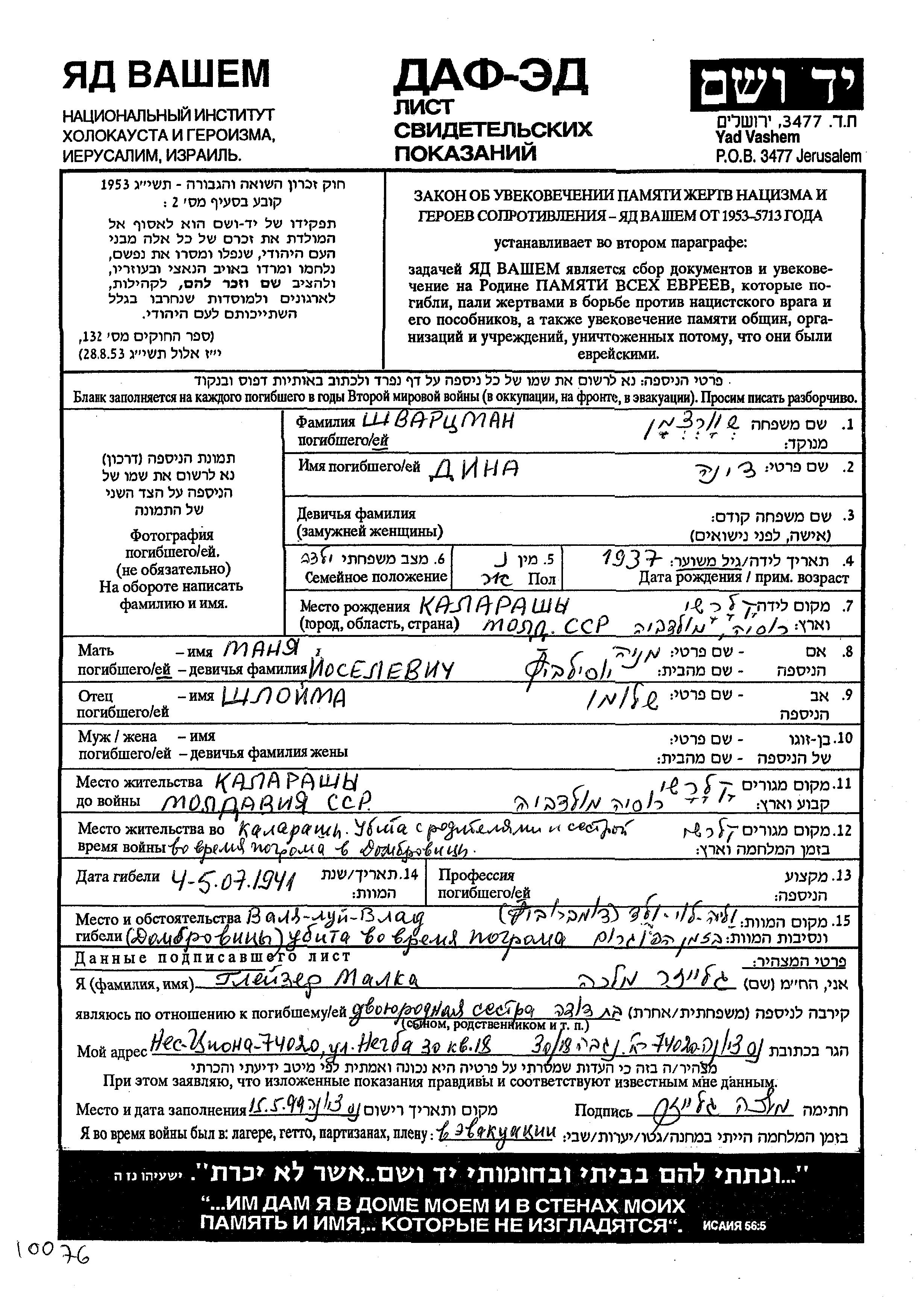 Shvartzman Dina 1937 Kalarash, Rumänien Gedenkblatt